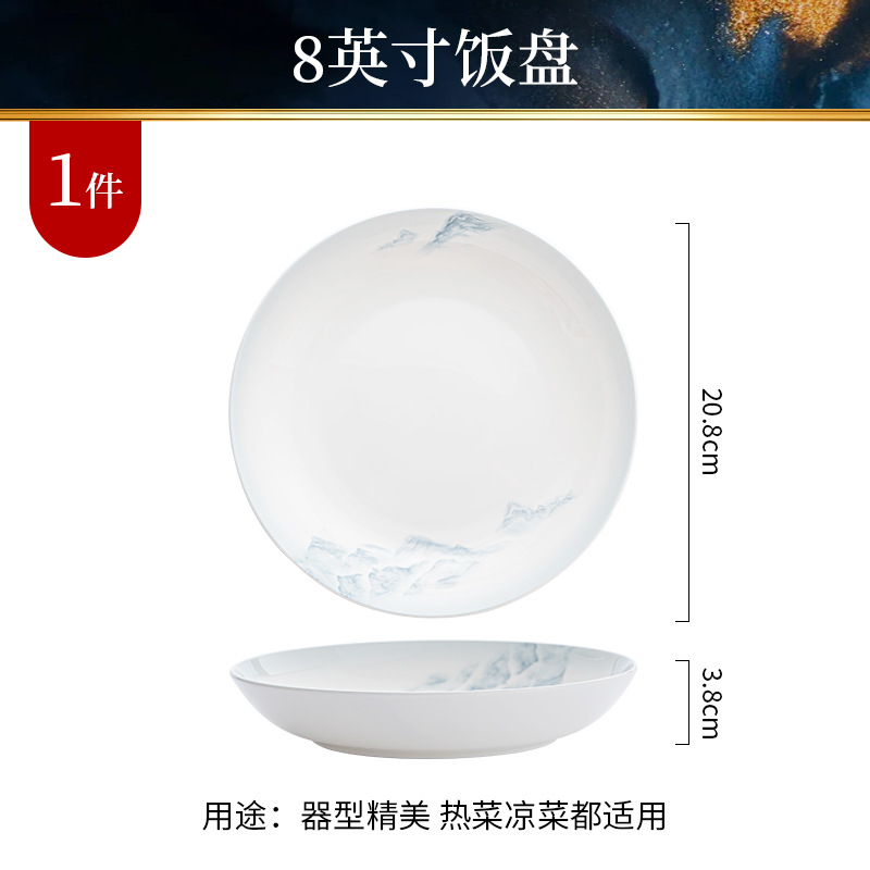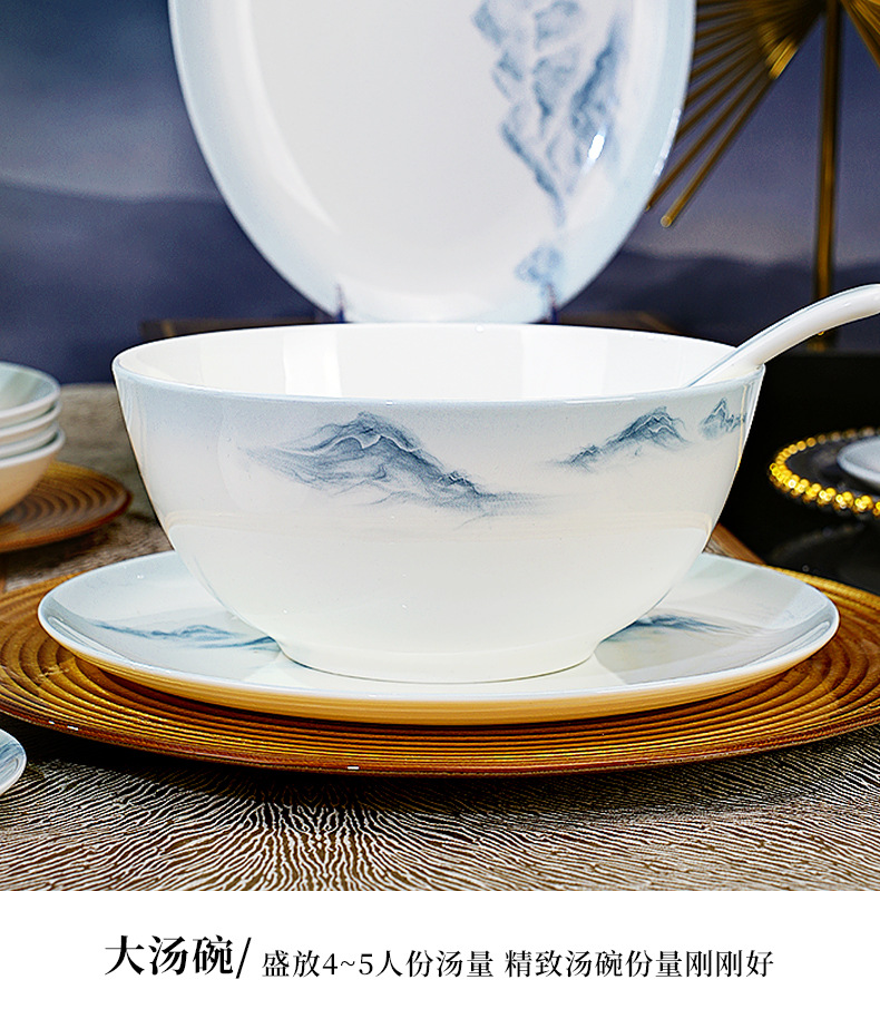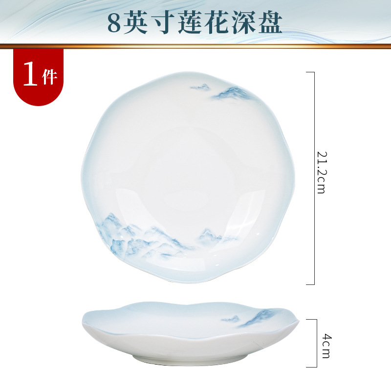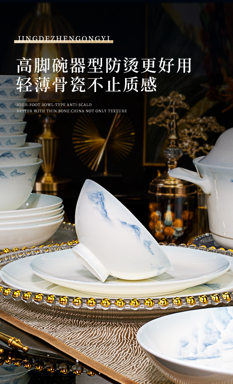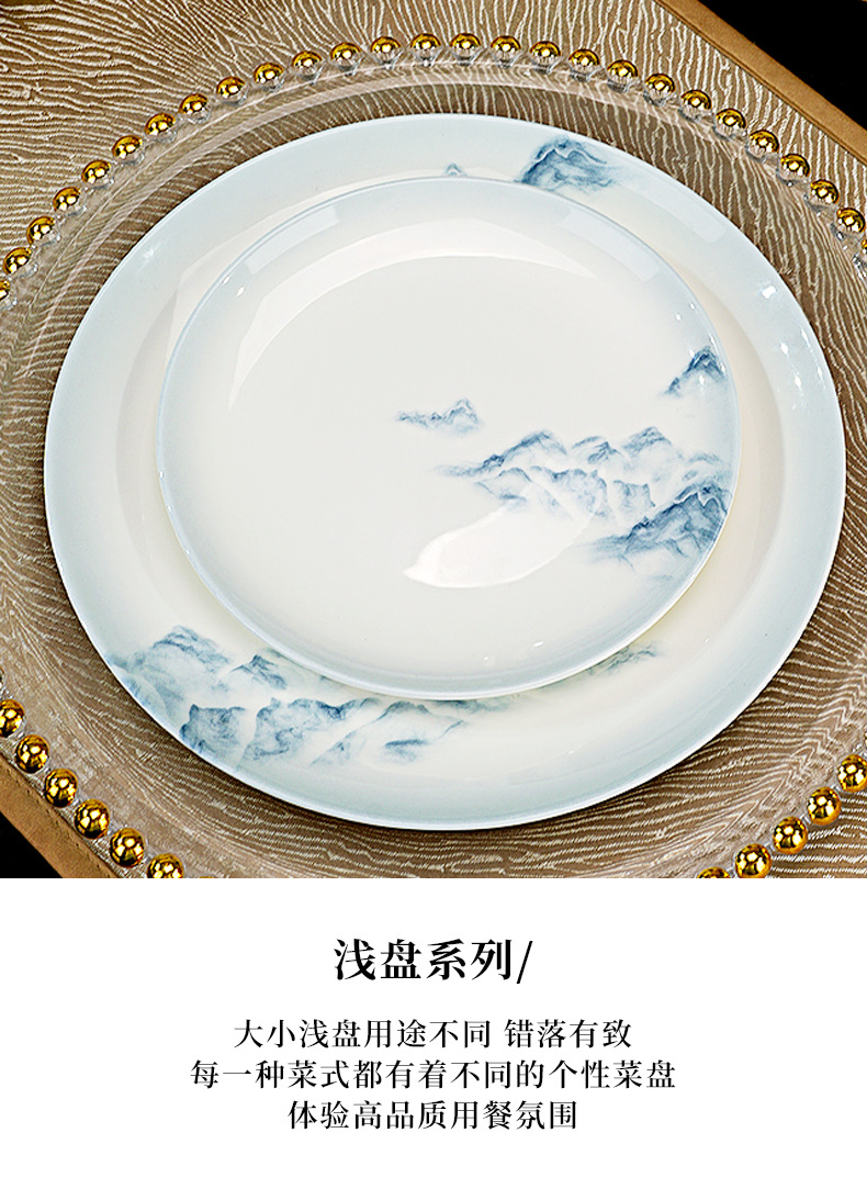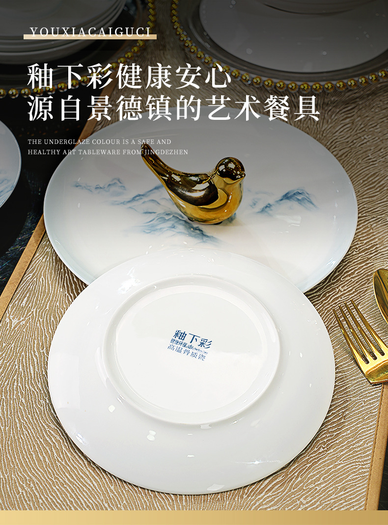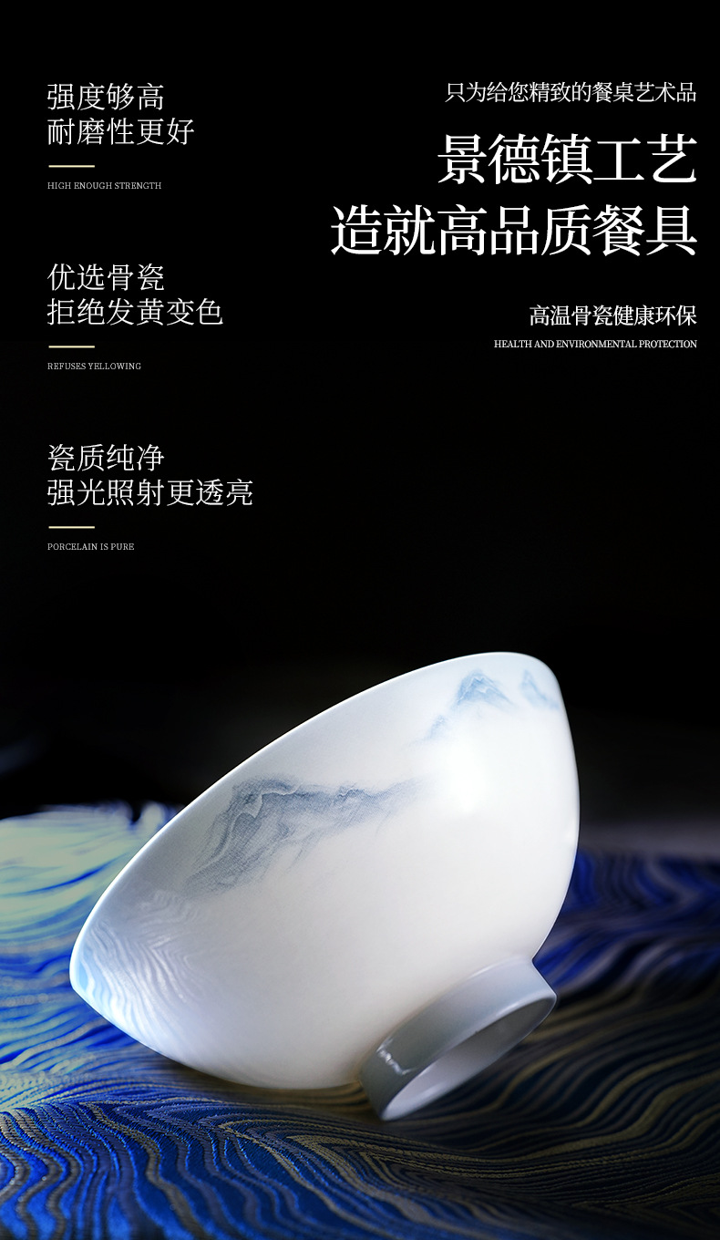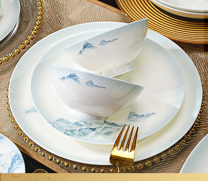 탕산 본차이나 그릇 가정용 유약 밑색 식기 세라믹 국그릇 밥그릇 접시 풍경 중국풍 도매