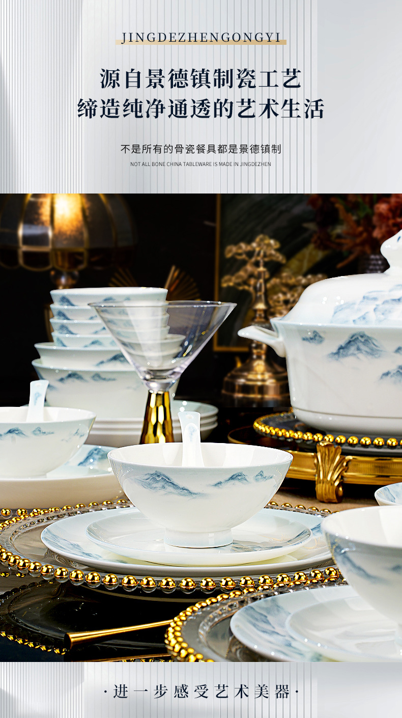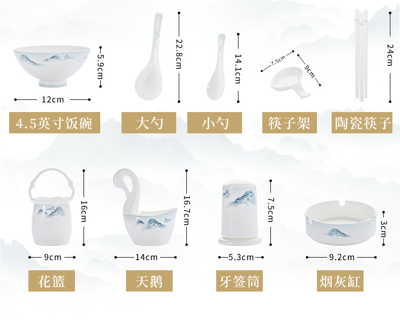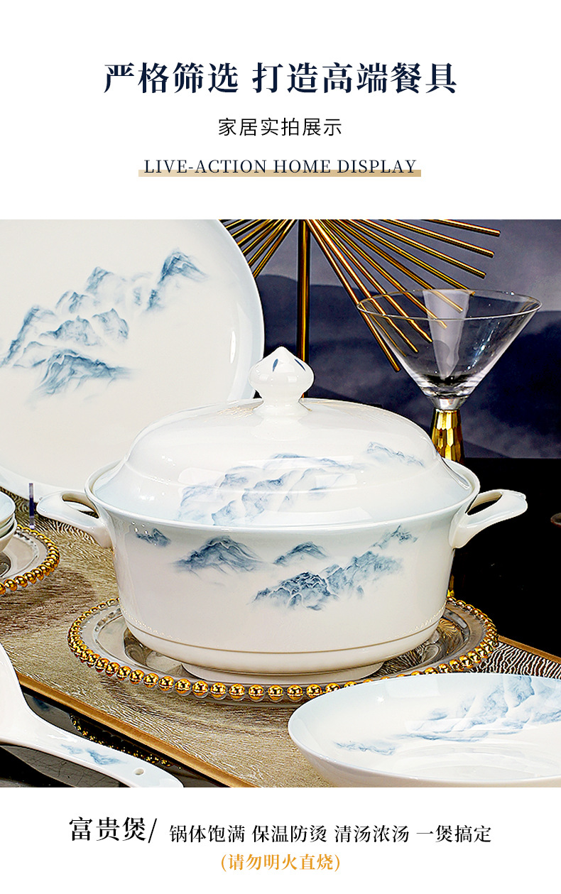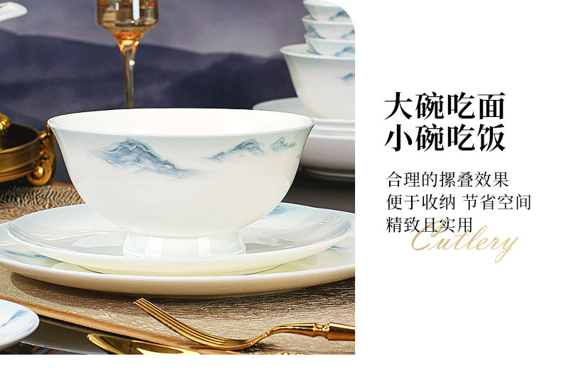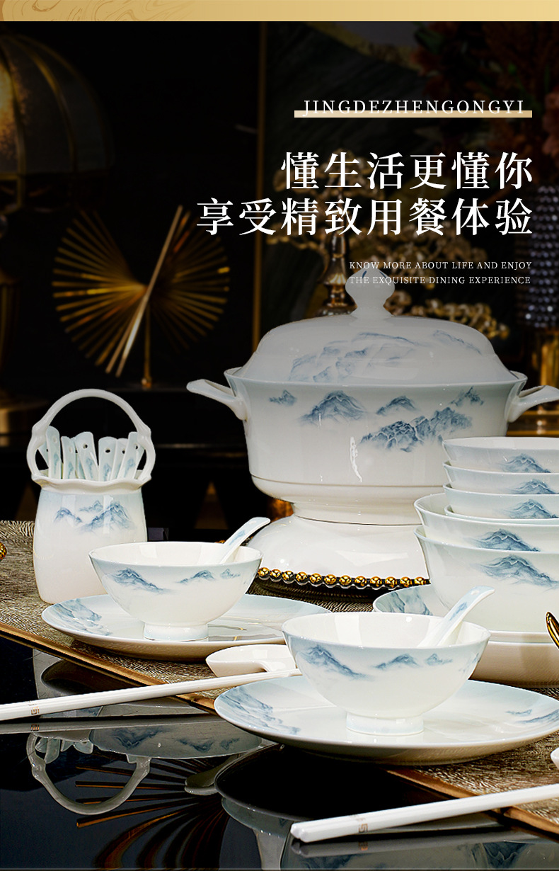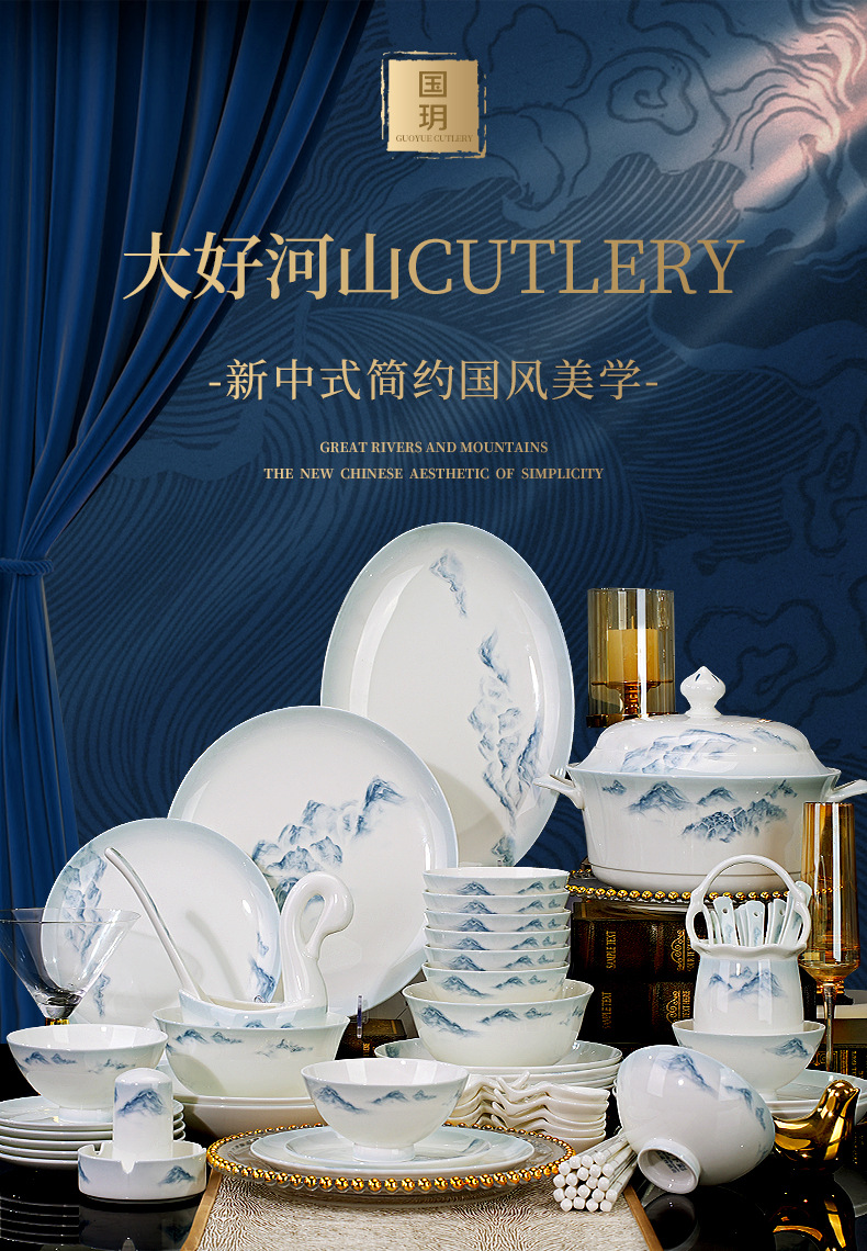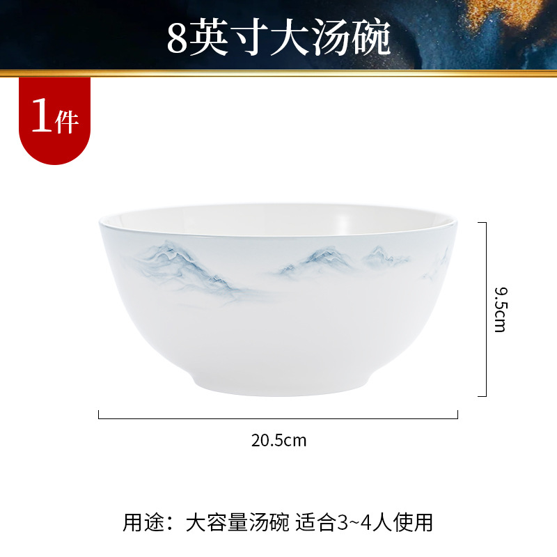 탕산 본차이나 그릇 가정용 유약 밑색 식기 세라믹 국그릇 밥그릇 접시 풍경 중국풍 도매