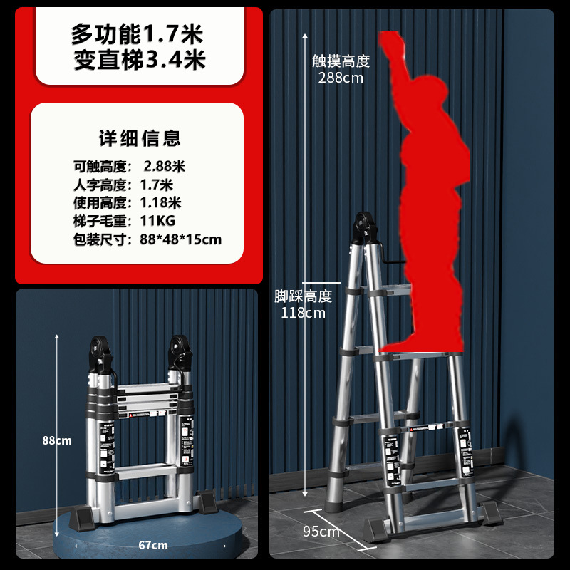 • 스테인레스 스틸 다기능 1.7+ 1.7m = 직선 사다리 3.4m