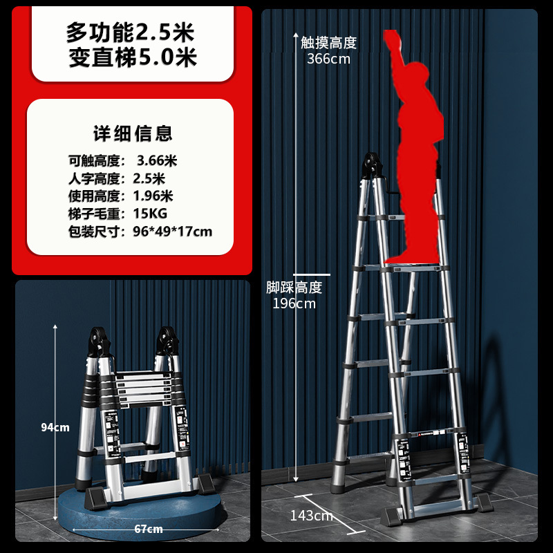 • 스테인레스 스틸 다기능 2.5+ 2.5m = 직선 사다리 5.0m