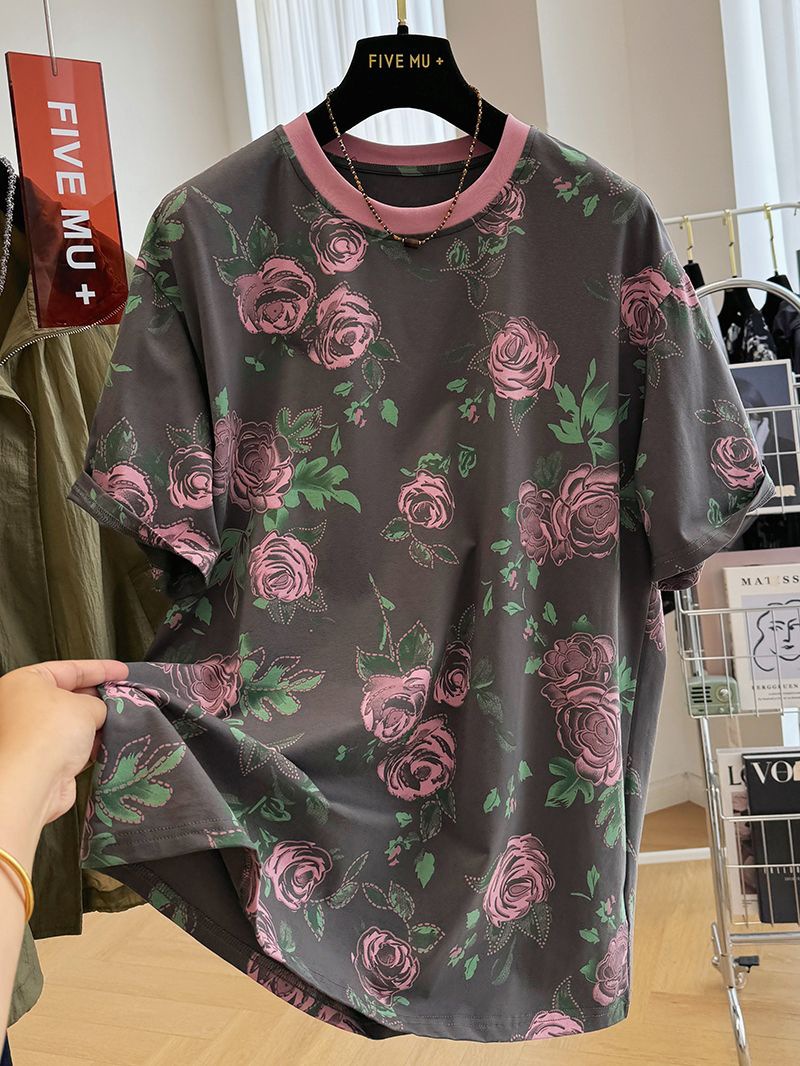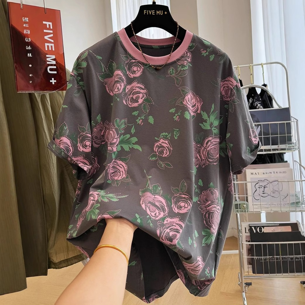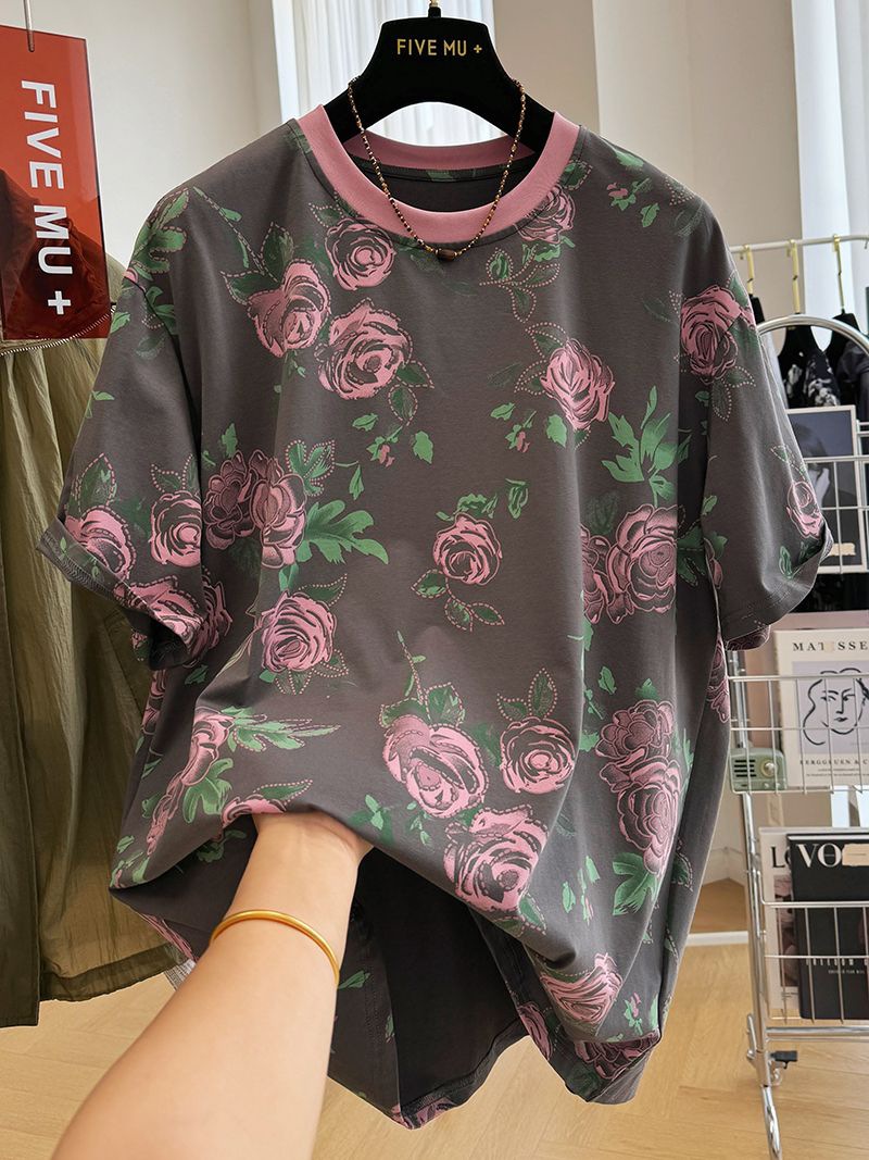 오버 사이즈 300 진 레트로 서양식 크루 넥 반팔 티셔츠 여성 여름 독특한 느슨한 반소매 탑 티셔츠