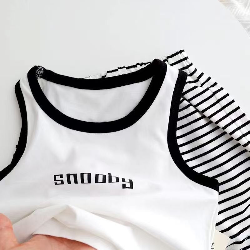 2025 새로운 여름 세트 어린이 슈퍼 귀여운 만화 조끼 민소매 줄무늬 반바지 2 피스 세트 소년 소녀 아기 어린이스토어 가기