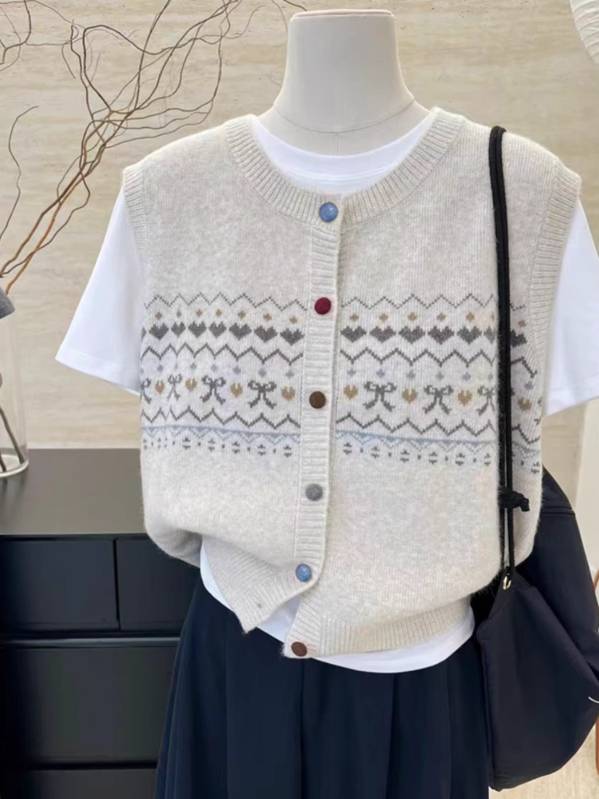 빈티지 서양식 자카드 니트 카디건 조끼 여성 가을과 겨울 라운드 넥 게으른 스타일 느슨한 캐주얼 스택 웨이스트 코트 조끼