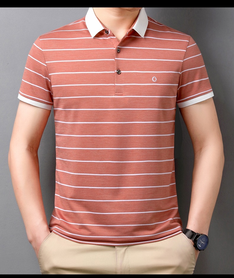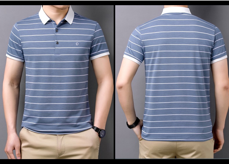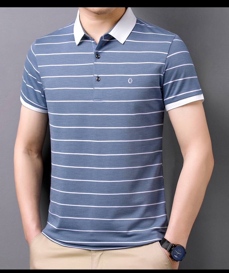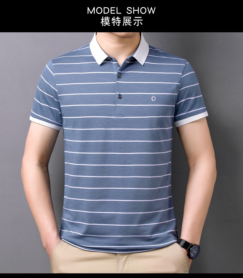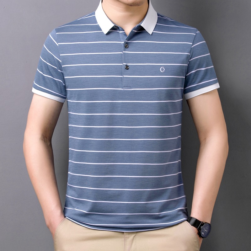 고급 뽕나무 실크 여름 남성 POLO 셔츠 비즈니스 캐주얼 스트라이프 비 아이언 남성 반팔 탑스토어 가기