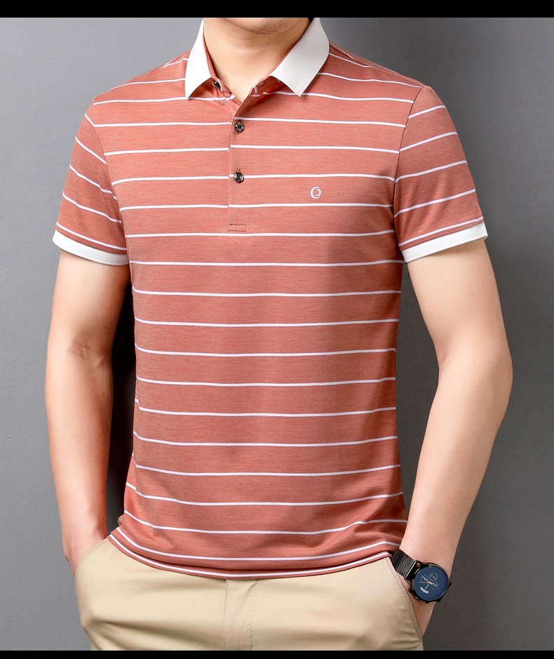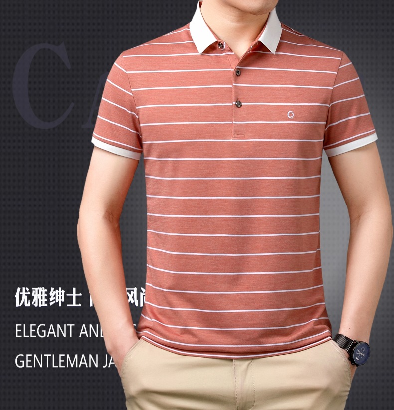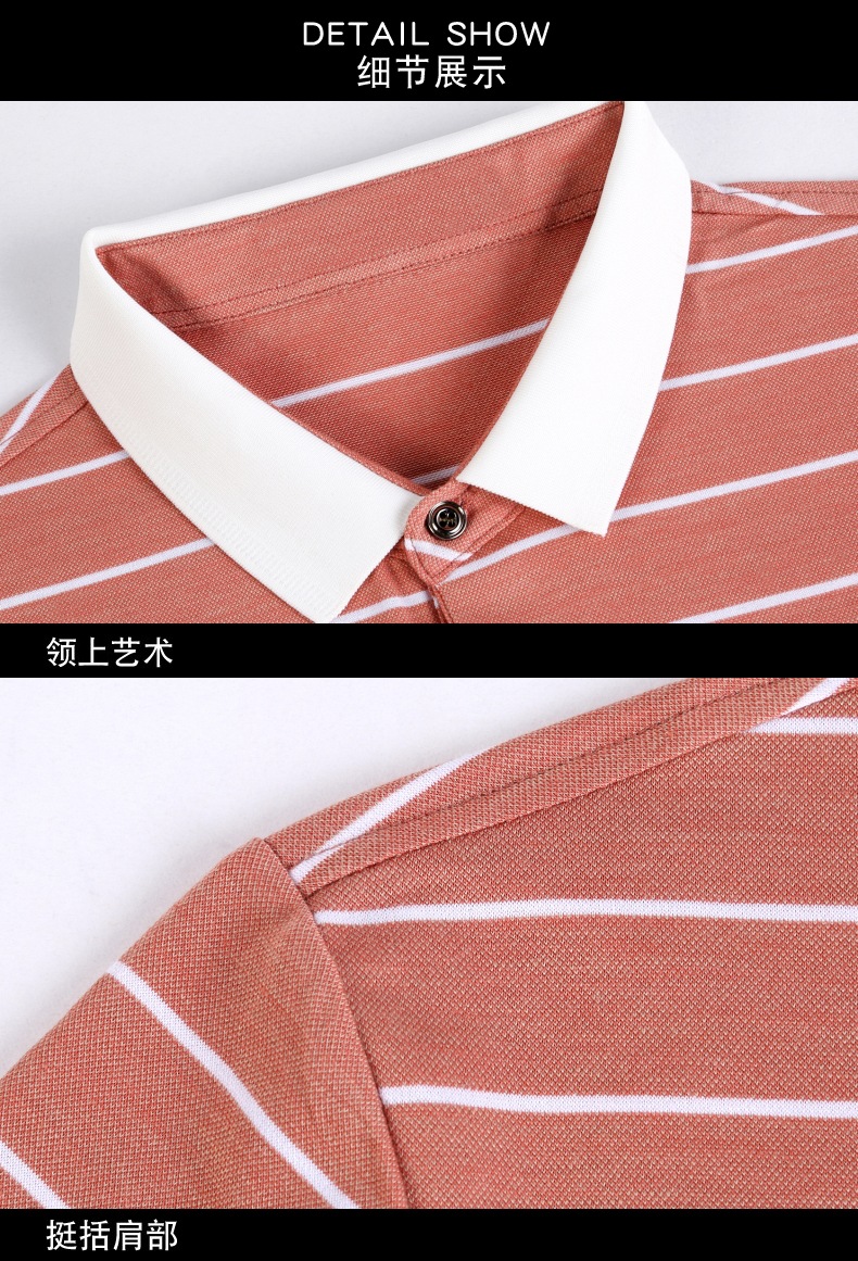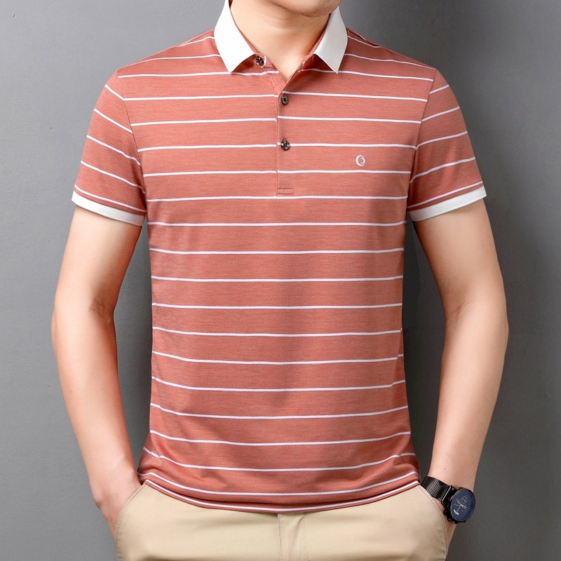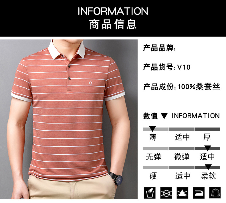 고급 뽕나무 실크 여름 남성 POLO 셔츠 비즈니스 캐주얼 스트라이프 비 아이언 남성 반팔 탑