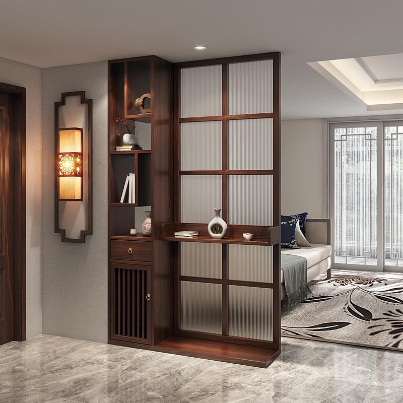 新中式长虹玻璃隔断屏风玄关客厅进门遮挡简约现代实木半墙置物架