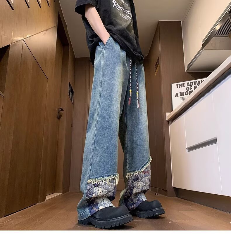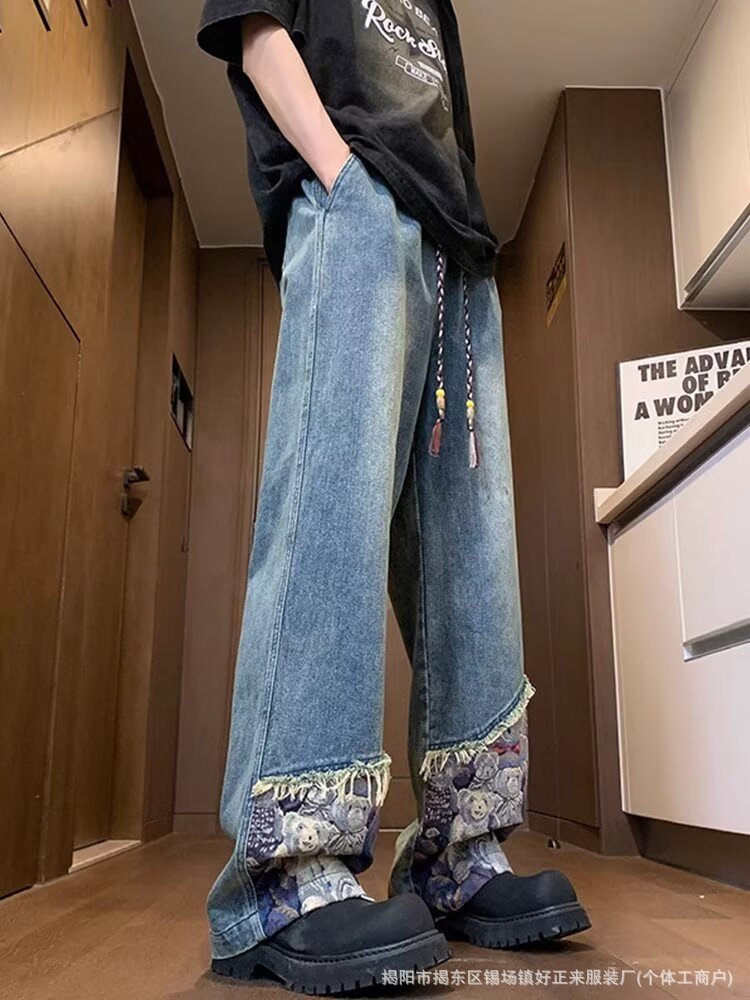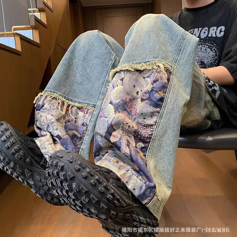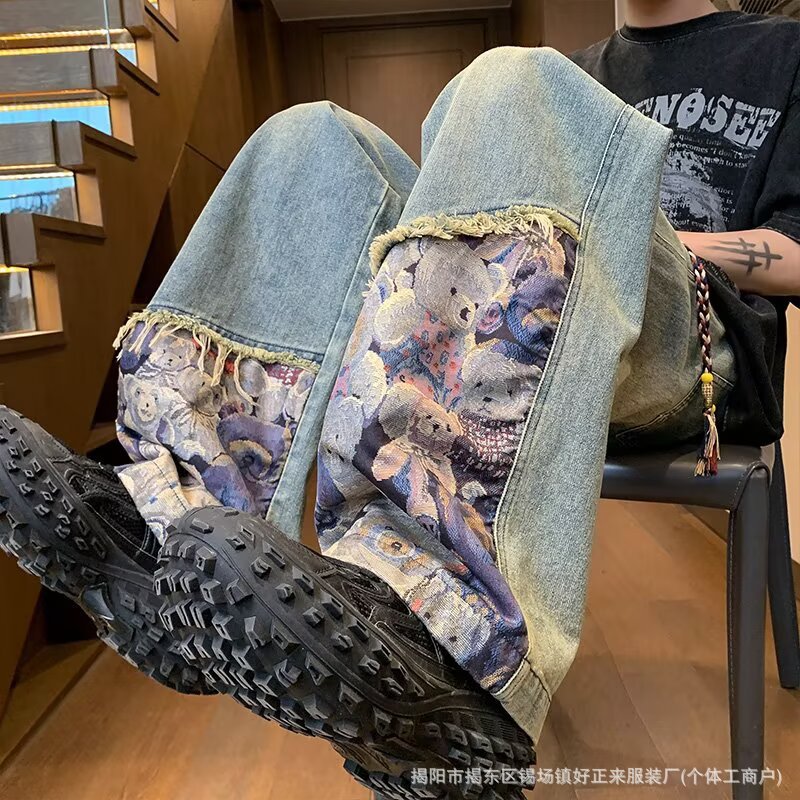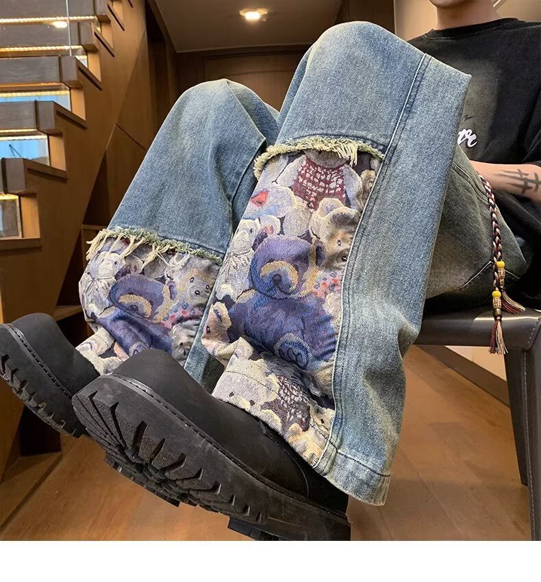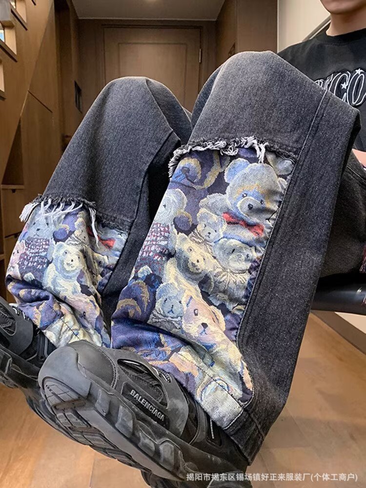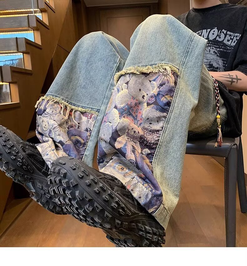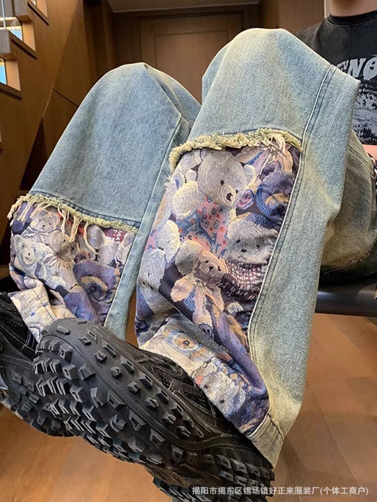 새로운 중국 스타일 곰 바느질 청바지 남성 가을 유행 브랜드 강아지 잘 생긴 작업복 스트레이트 바지 미국 빈티지 캐주얼 바지스토어 가기