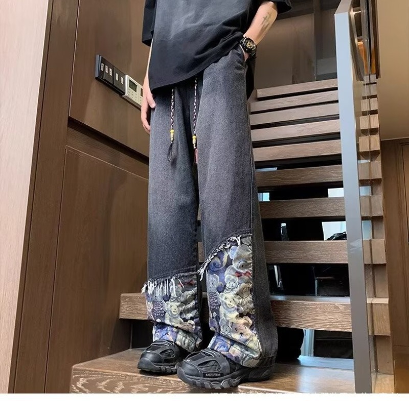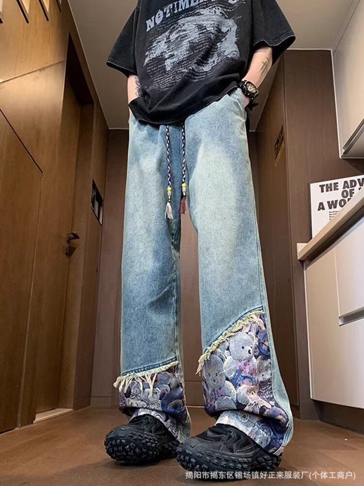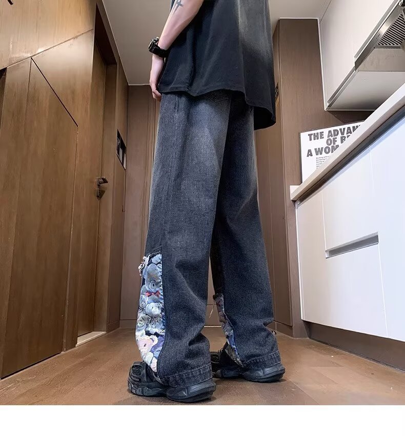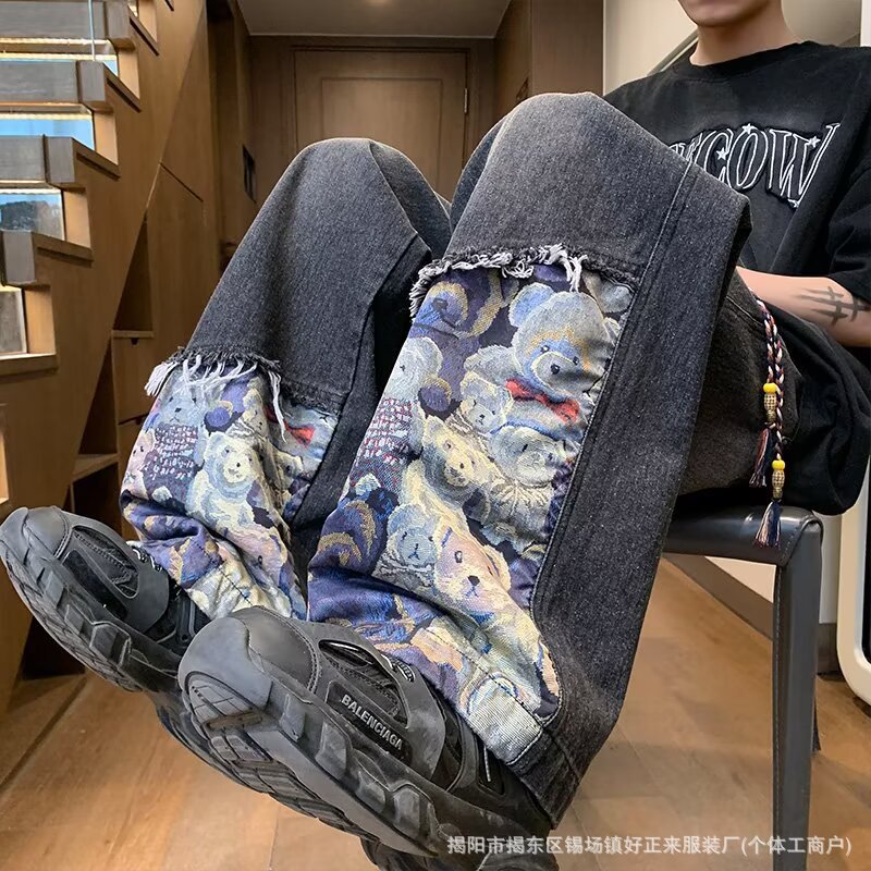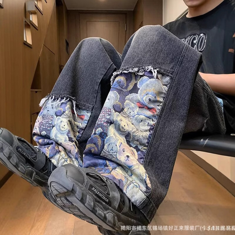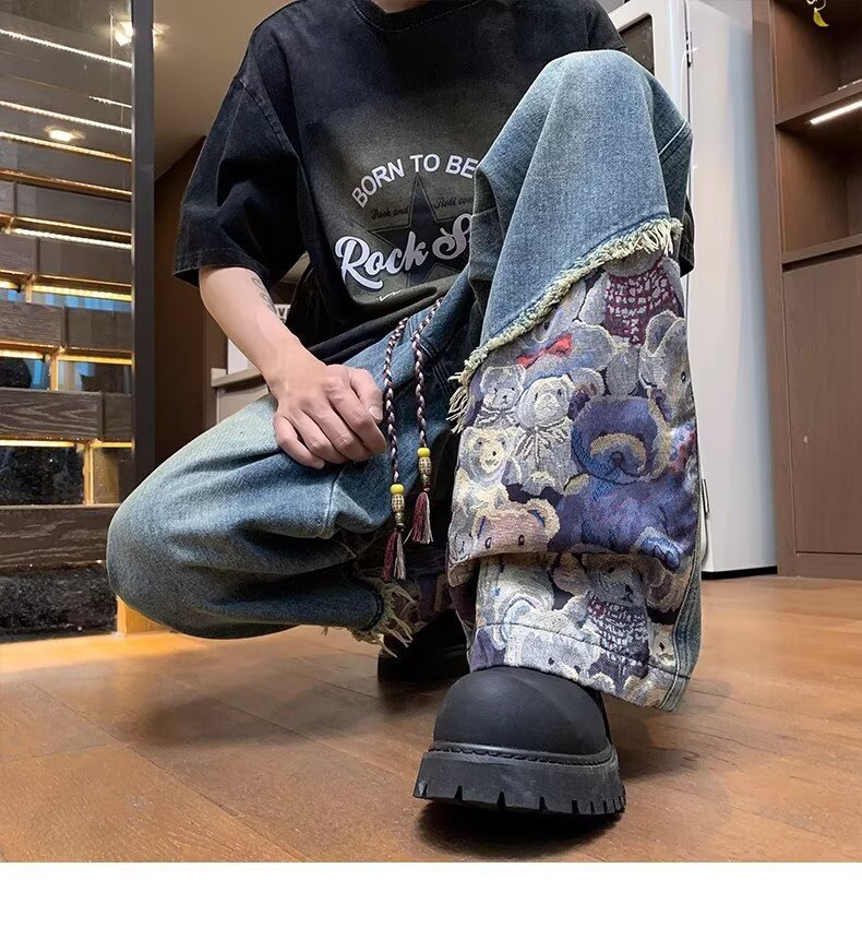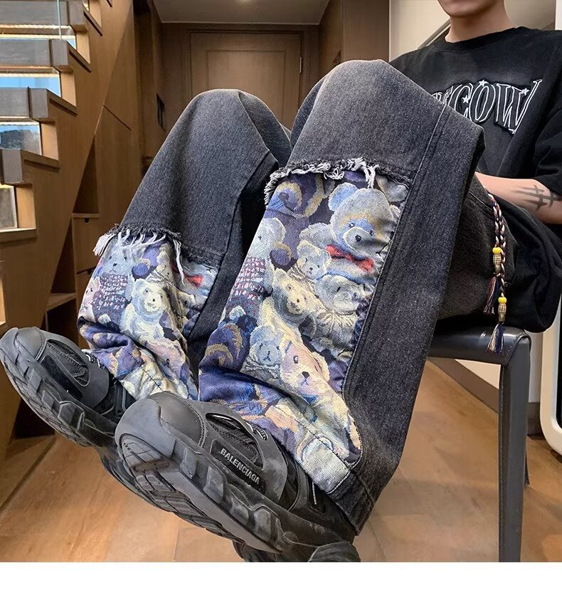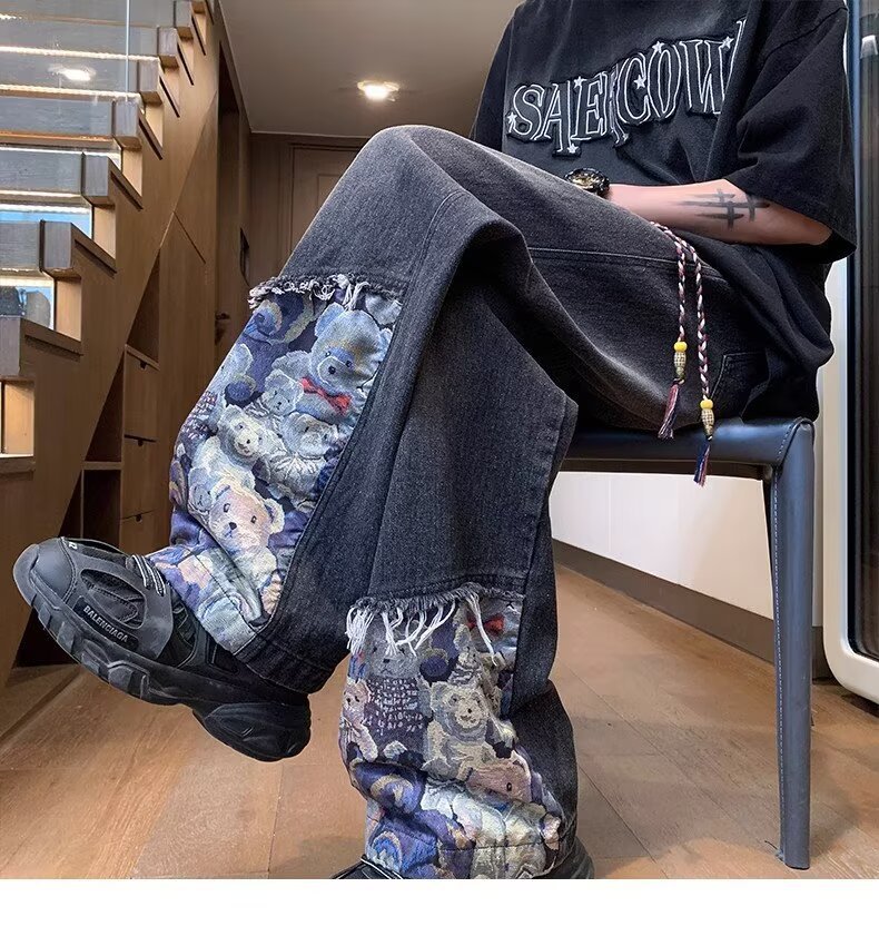 새로운 중국 스타일 곰 바느질 청바지 남성 가을 유행 브랜드 강아지 잘 생긴 작업복 스트레이트 바지 미국 빈티지 캐주얼 바지스토어 가기