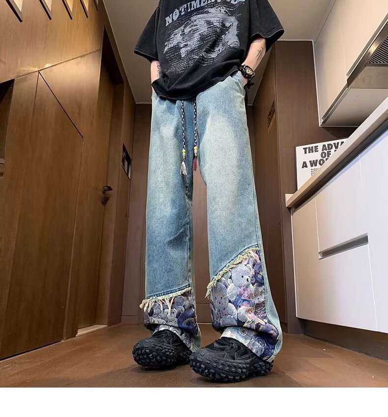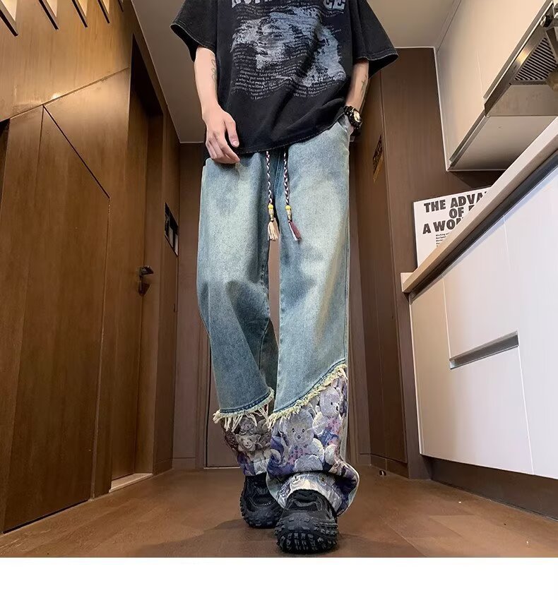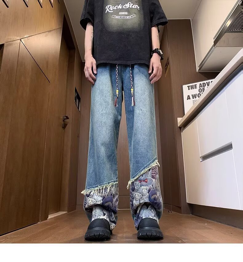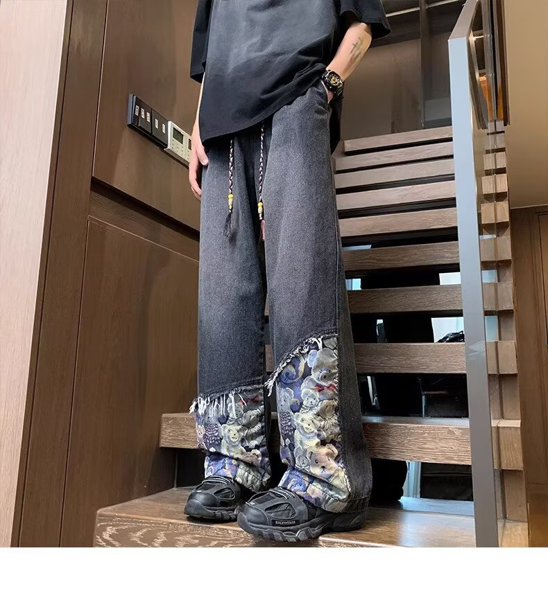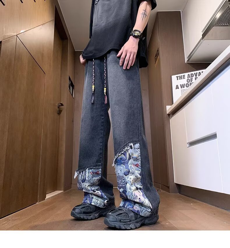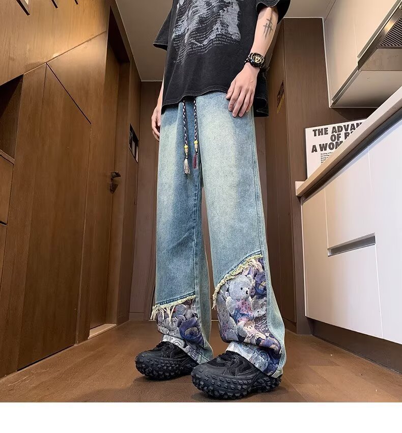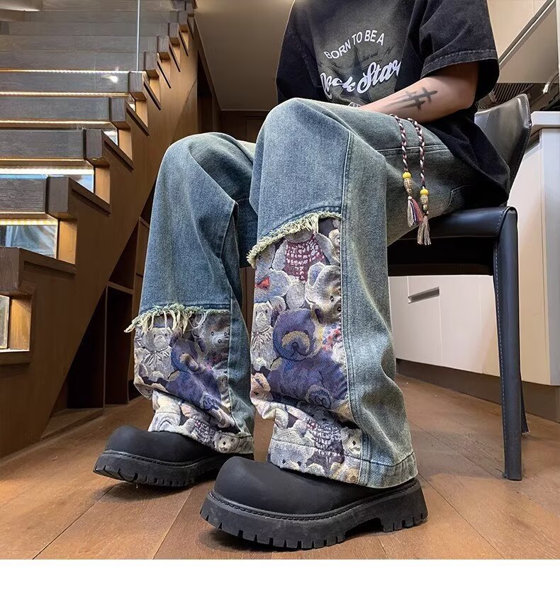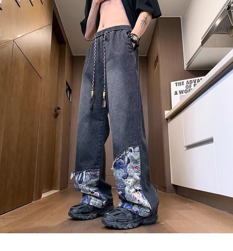 새로운 중국 스타일 곰 바느질 청바지 남성 가을 유행 브랜드 강아지 잘 생긴 작업복 스트레이트 바지 미국 빈티지 캐주얼 바지스토어 가기