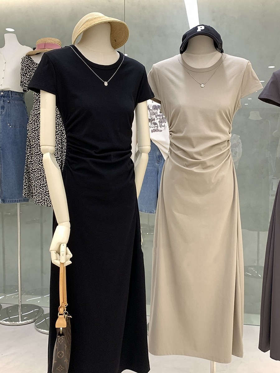 프랑스 Crewneck 주름 반팔 허리 라인 긴 원피스 여성 여름 빛 유행 우아한 원피스스토어 가기