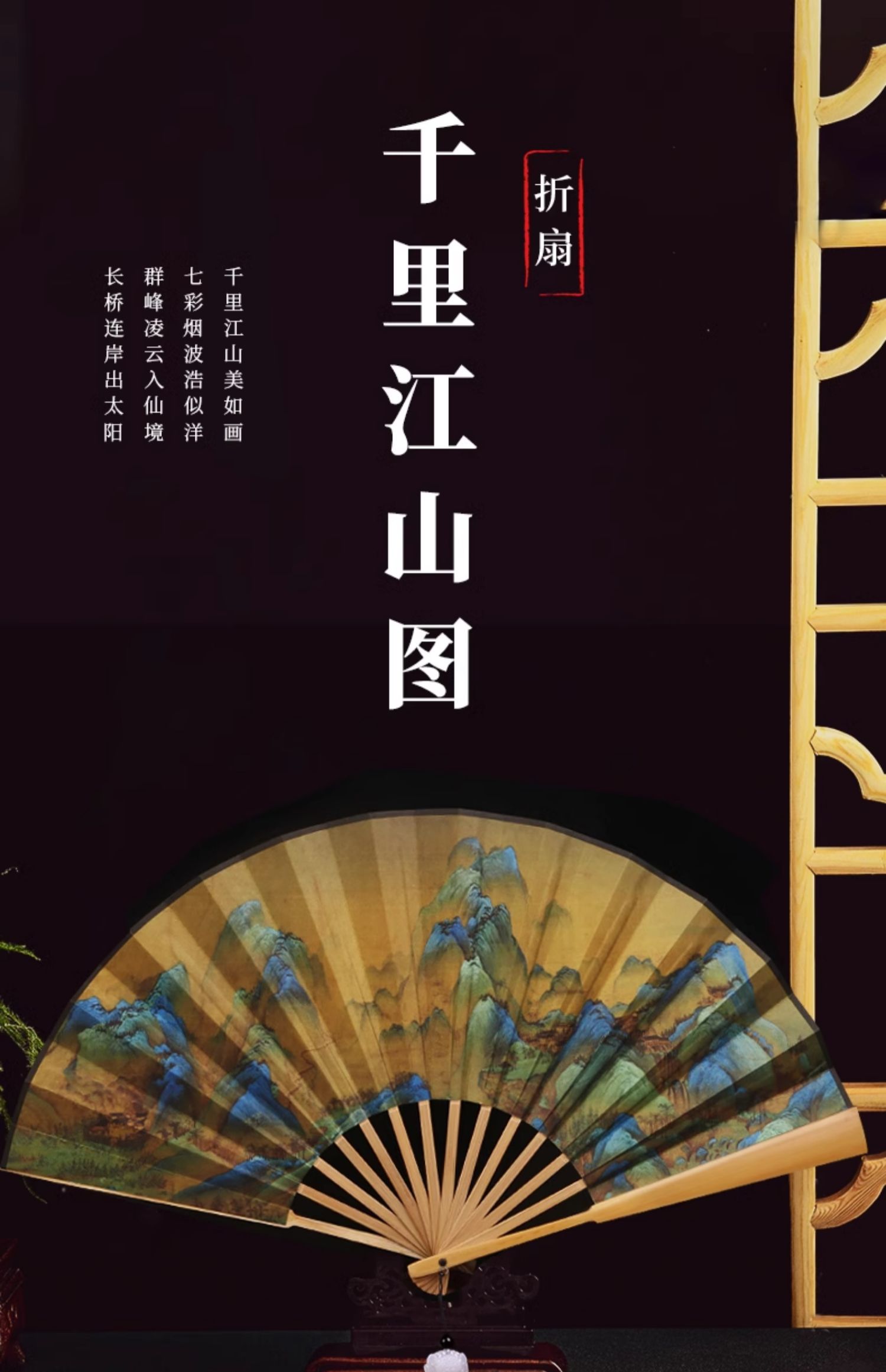 Qianli Jiangshan 피겨 팬 중국 스타일 남자와 여자의 한 옷 실크 옷 여름 골동품 선물 접히는 팬