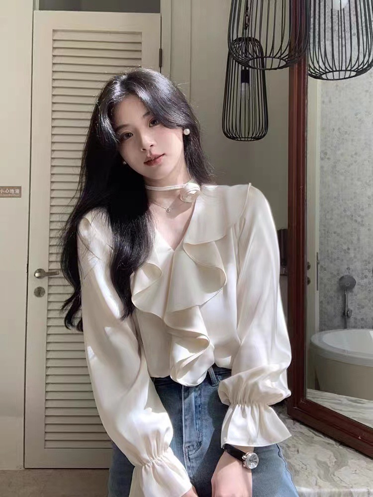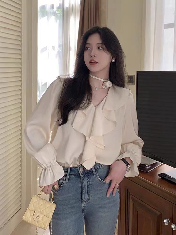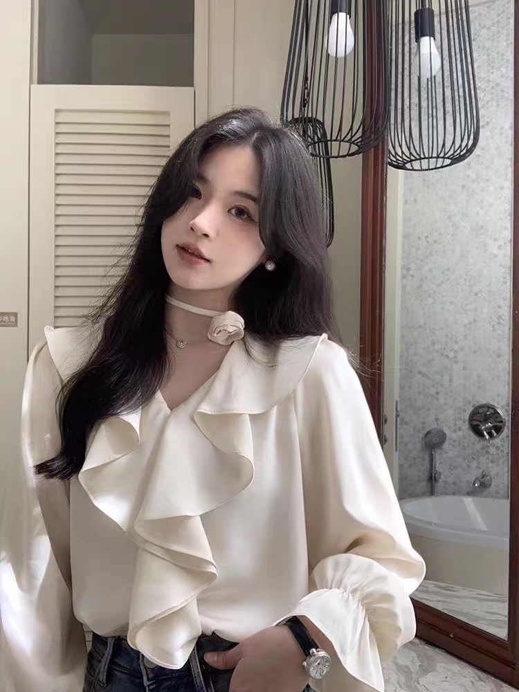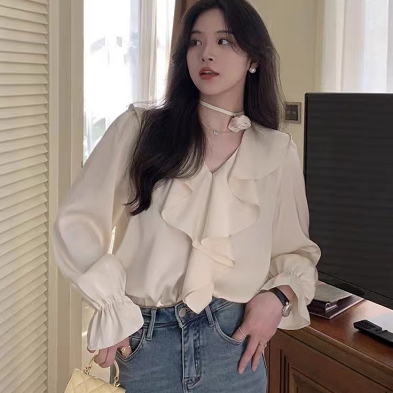 플러스 사이즈 V 넥 러플 셔츠 여성용 봄과 가을 디자인 틈새 프랑스 셔츠스토어 가기