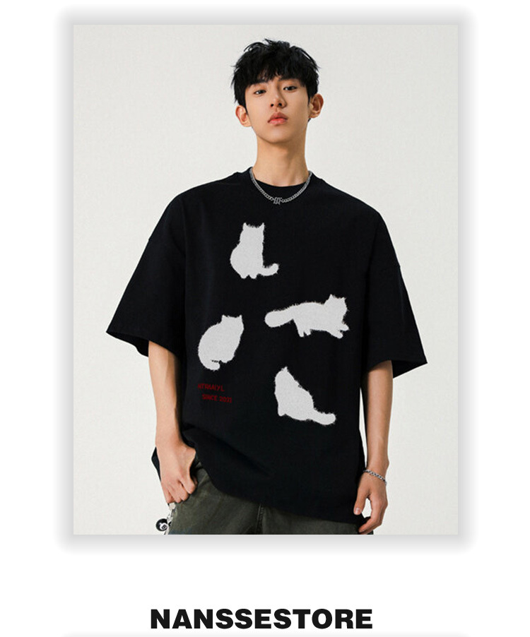 220g 무거운 고양이 인쇄 반팔 티셔츠 남자 2025 년 여름 새로운 미국 패션 브랜드 느슨한 반팔 티셔츠스토어 가기