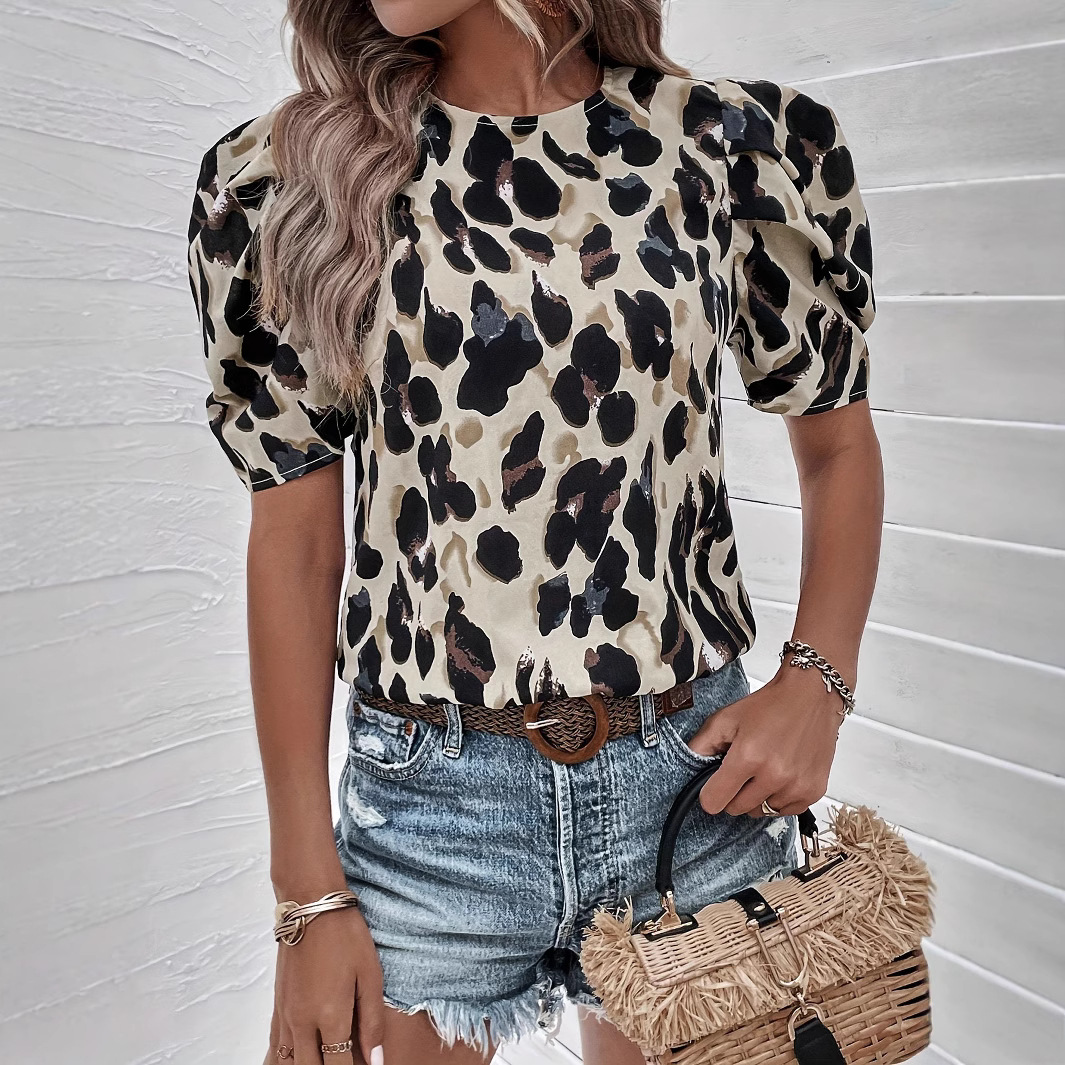 여자 여름 새 레오파드 무늬 퍼프 슬리브 여자 셔츠 아마존 유럽 및 미국 국경 여자 정상스토어 가기