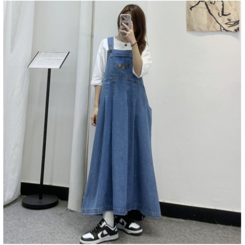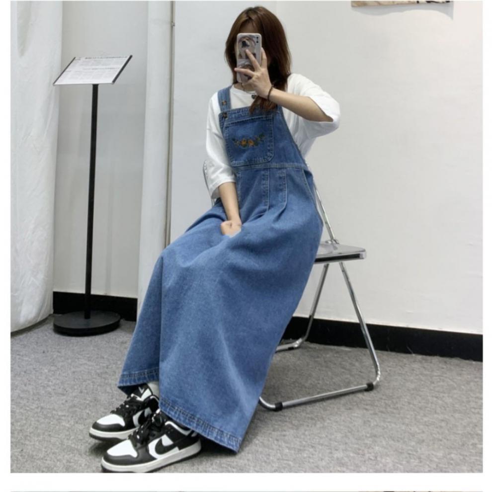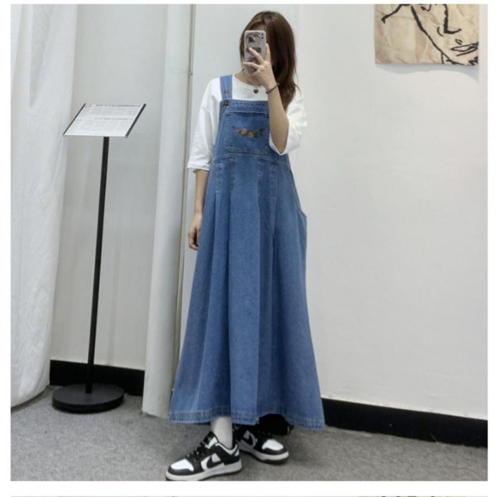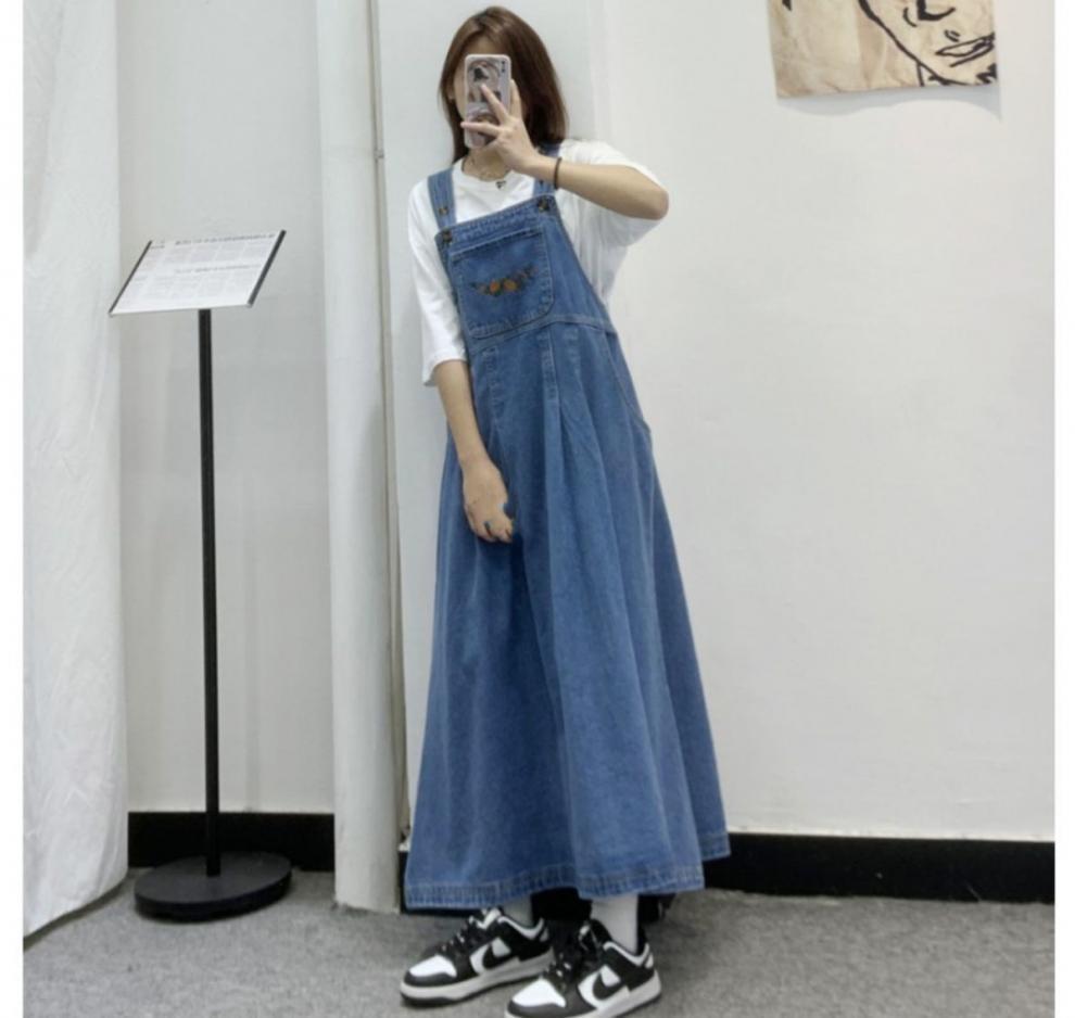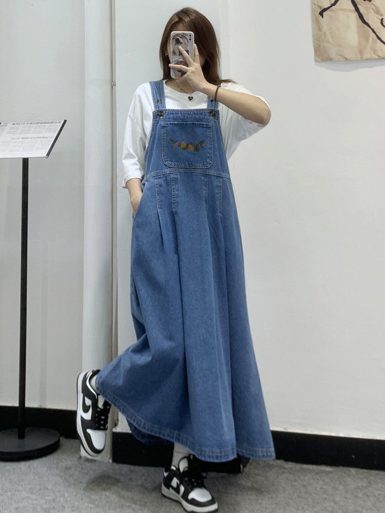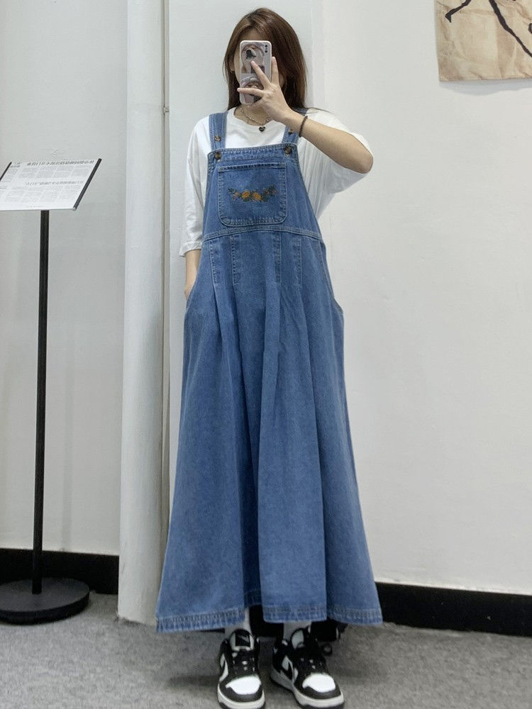 자수 데님 스트랩 원피스 여성 2025 년 여름 새 한국식 느슨한 디자인 센스 틈새 대형 스윙 원피스스토어 가기