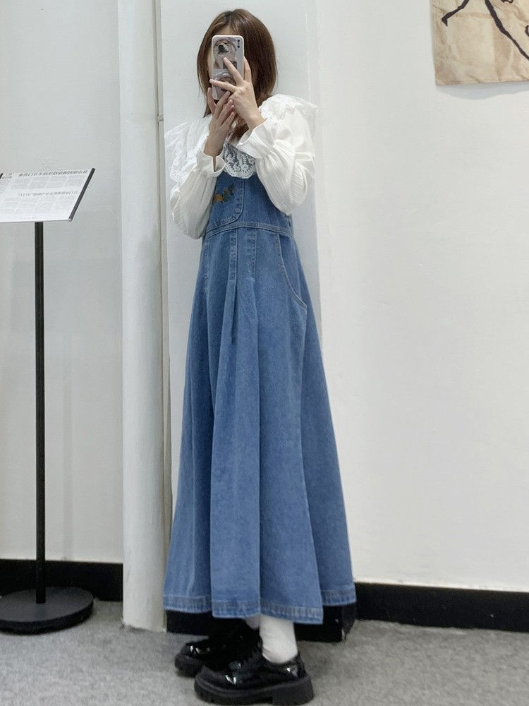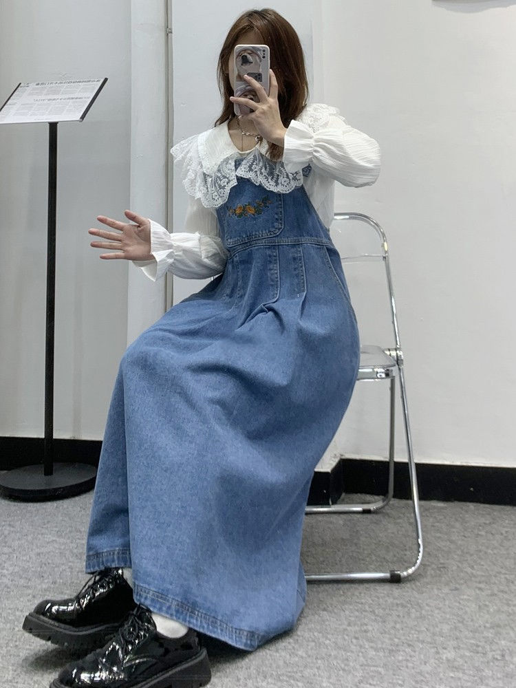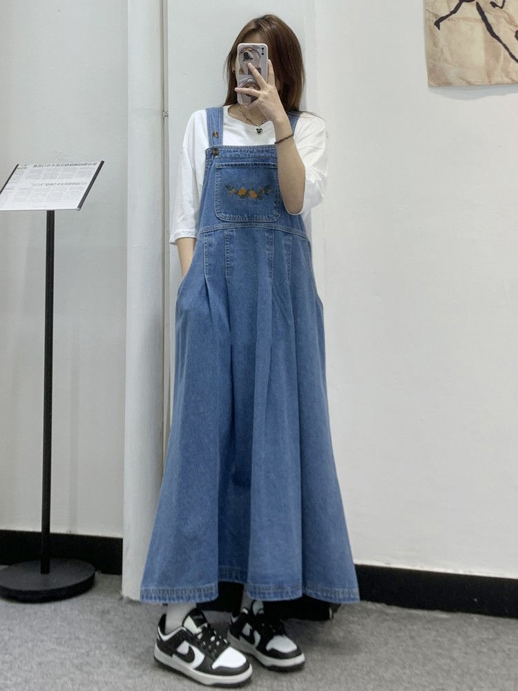 자수 데님 스트랩 원피스 여성 2025 년 여름 새 한국식 느슨한 디자인 센스 틈새 대형 스윙 원피스