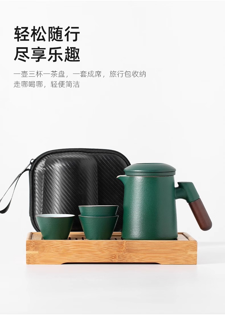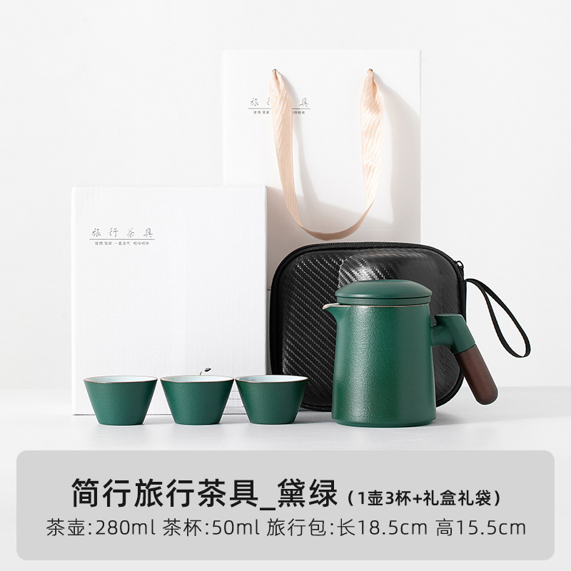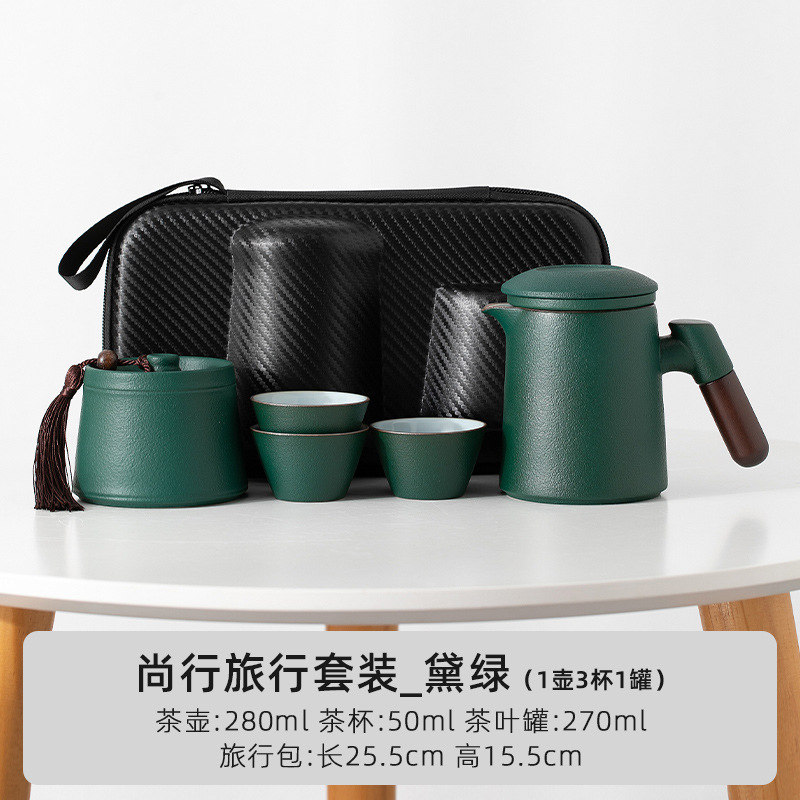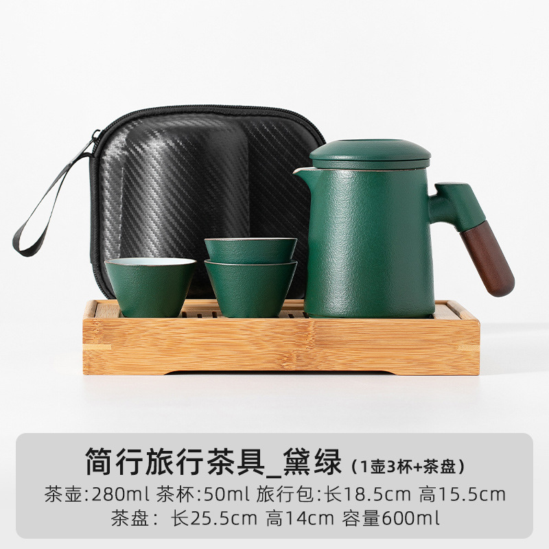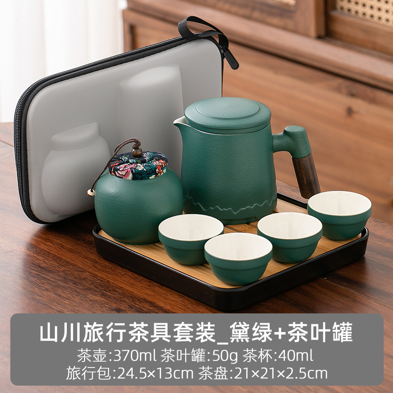 • Xinshan Lv 한 냄비, 네 컵 + 차 트레이 + 대형 여행 가방 - 진한 녹색