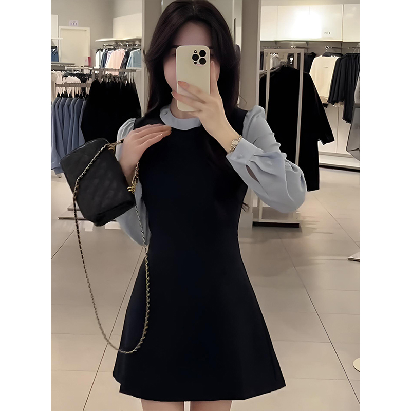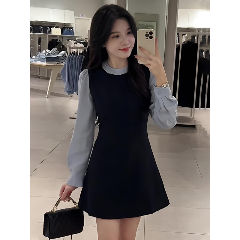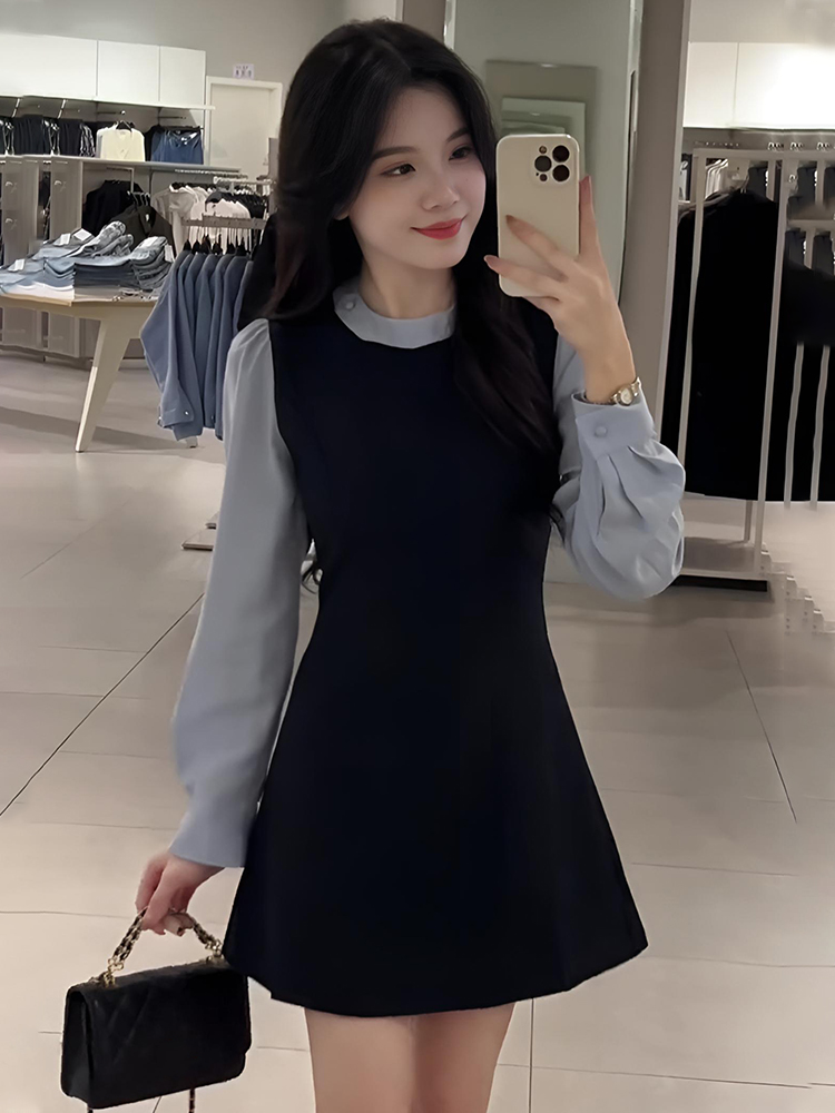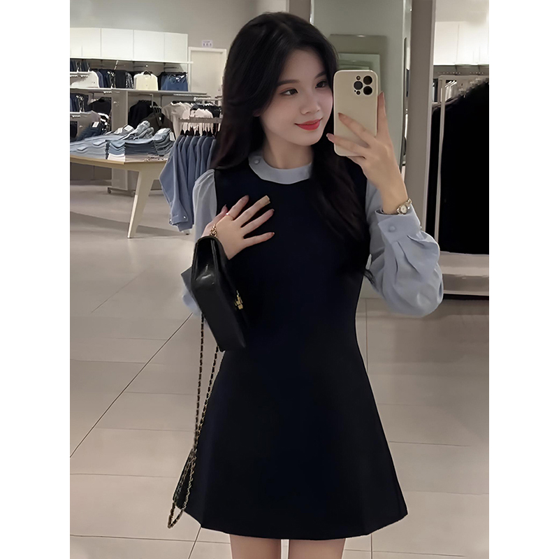 한국학과 대학 스타일 가짜 투피스 원피스 여자 봄 원피스 여자 2025 새로운 슬림핏 스티칭 스커트스토어 가기