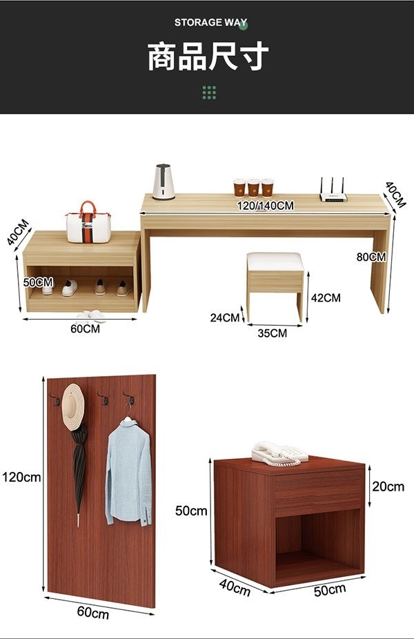 • 120 얕은 테이블 + 60 사이드 캐비닛 + 스툴 + 옷걸이 보드
