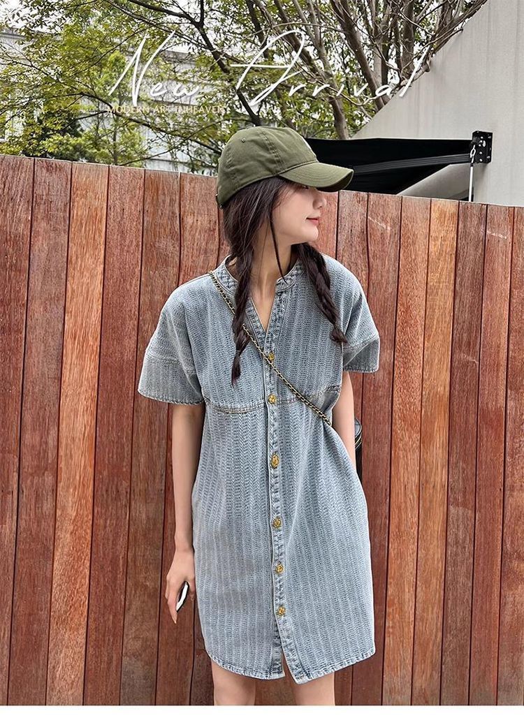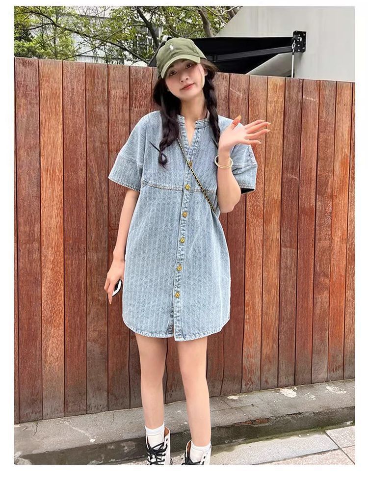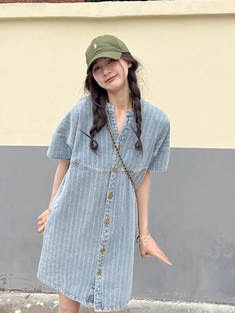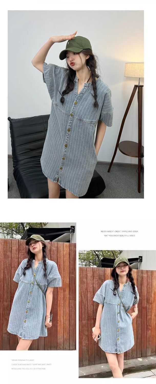자카드 줄무늬 칼라 데님 원피스 여성 2025 년 여름 새로운 한국 패션 느슨한 우아한 캐주얼 빈티지스토어 가기