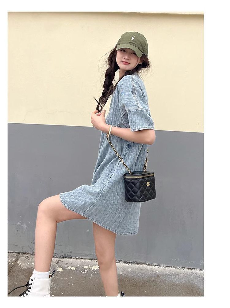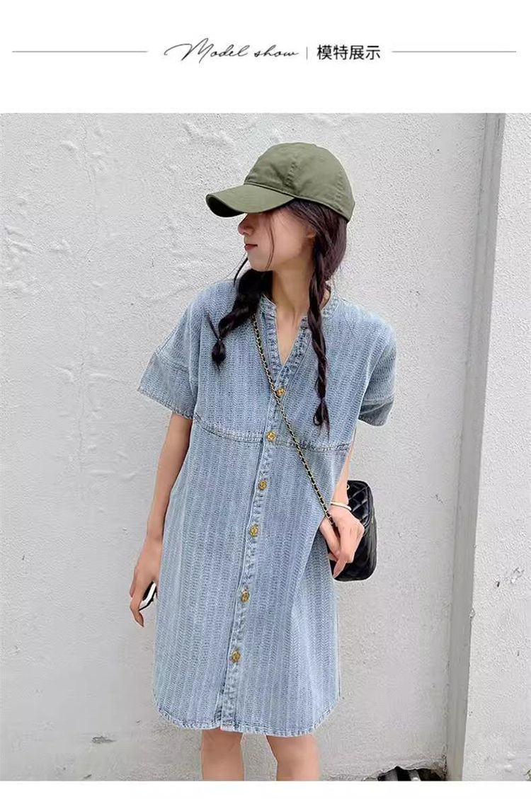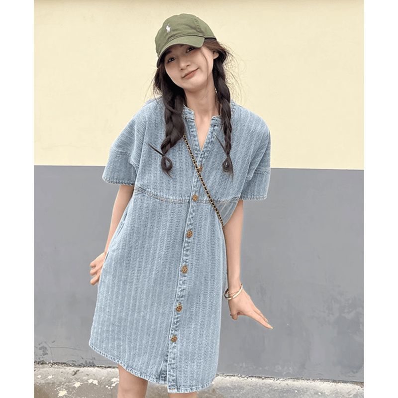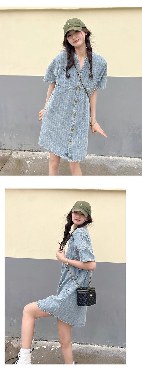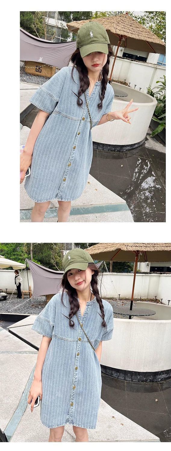 자카드 줄무늬 칼라 데님 원피스 여성 2025 년 여름 새로운 한국 패션 느슨한 우아한 캐주얼 빈티지스토어 가기