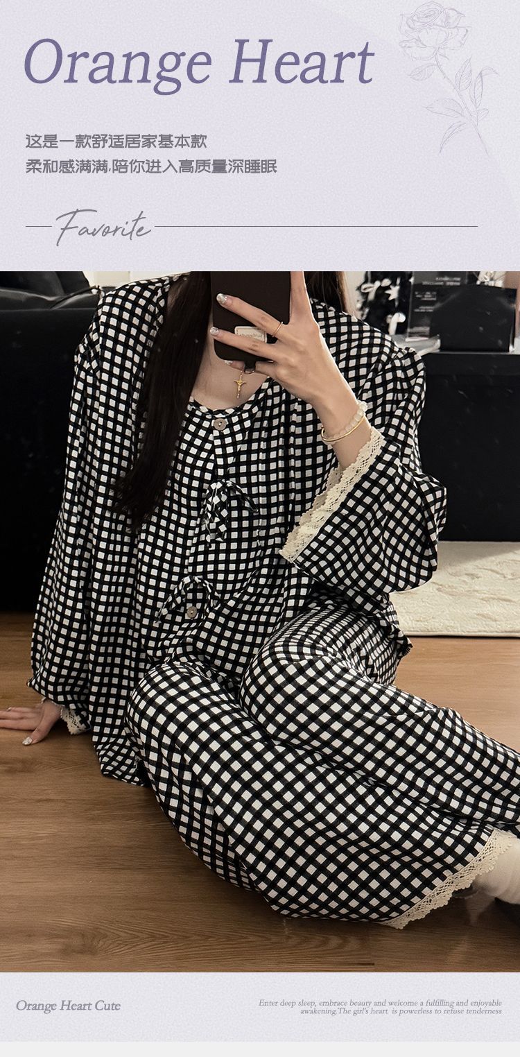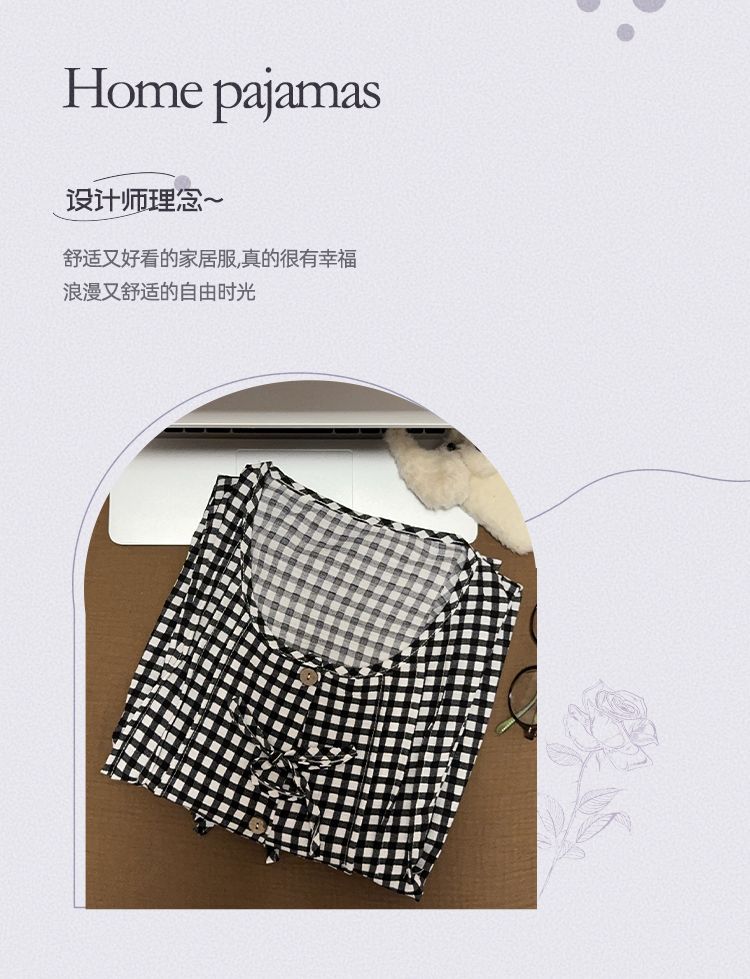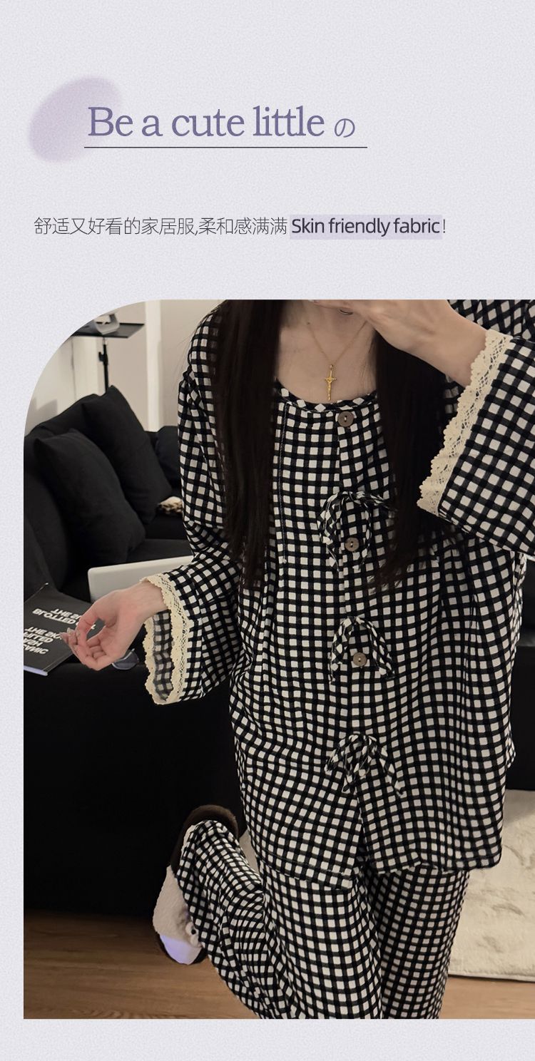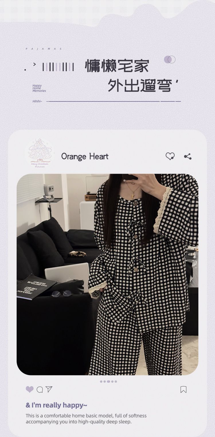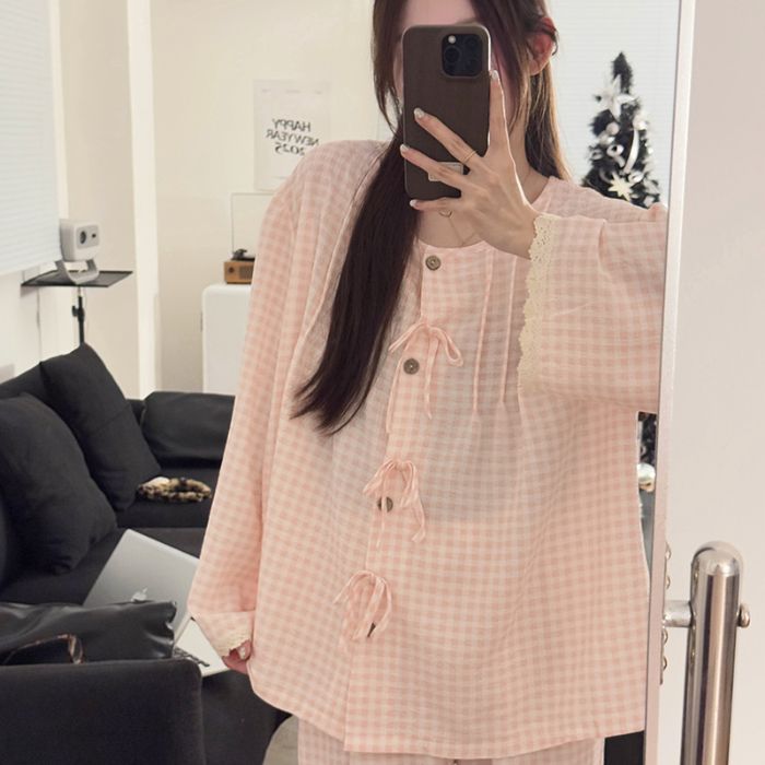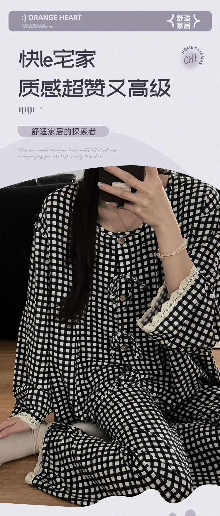 Ins 일본식 레이스 격자 무늬 잠옷 여성의 봄 둥근 목 긴 소매 달콤한 게으른 스타일 외부 착용 홈 의류 세트스토어 가기