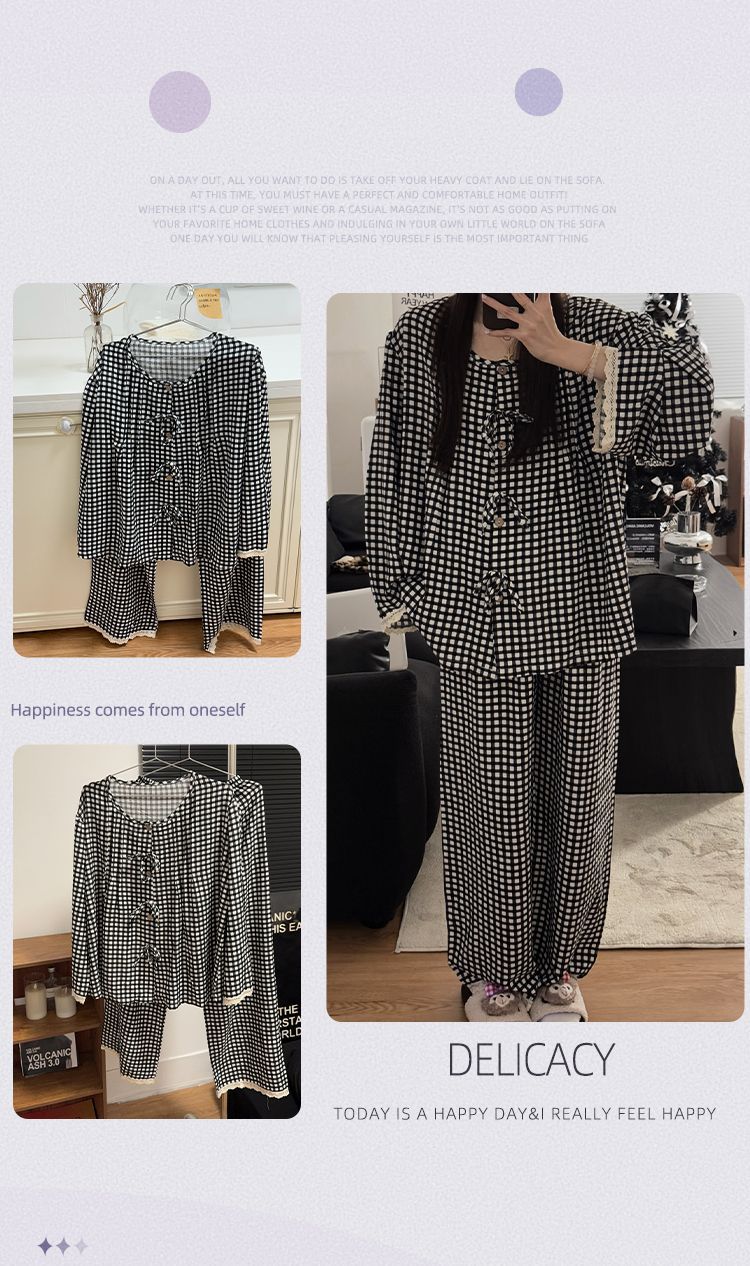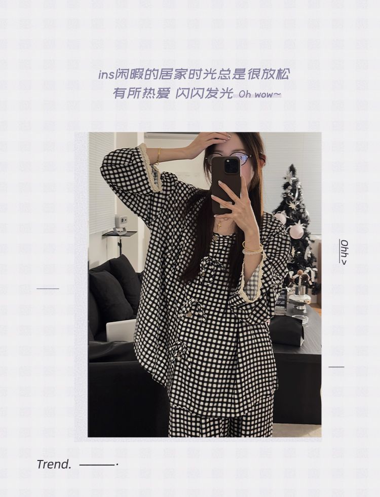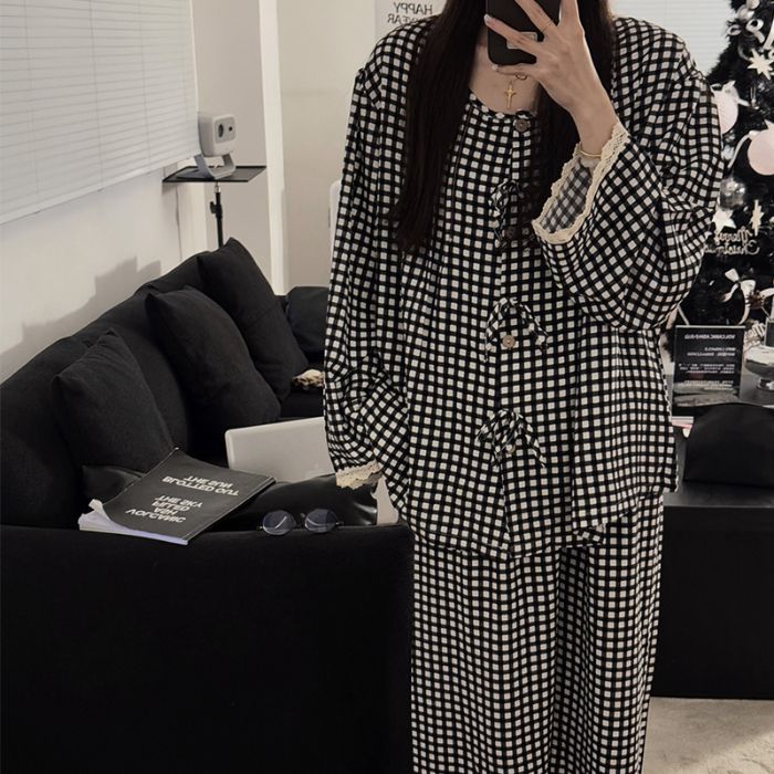 Ins 일본식 레이스 격자 무늬 잠옷 여성의 봄 둥근 목 긴 소매 달콤한 게으른 스타일 외부 착용 홈 의류 세트