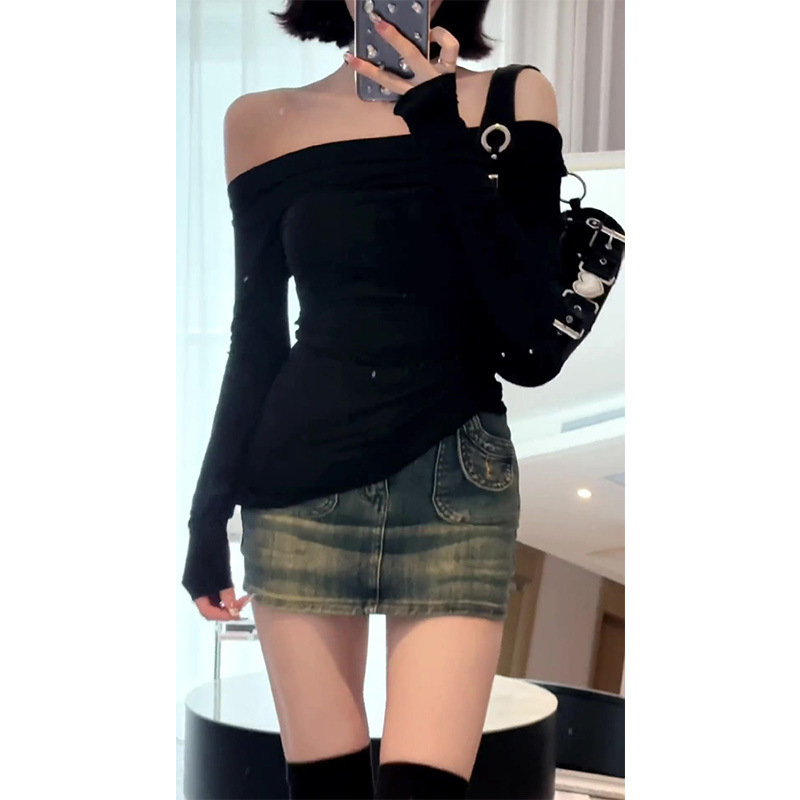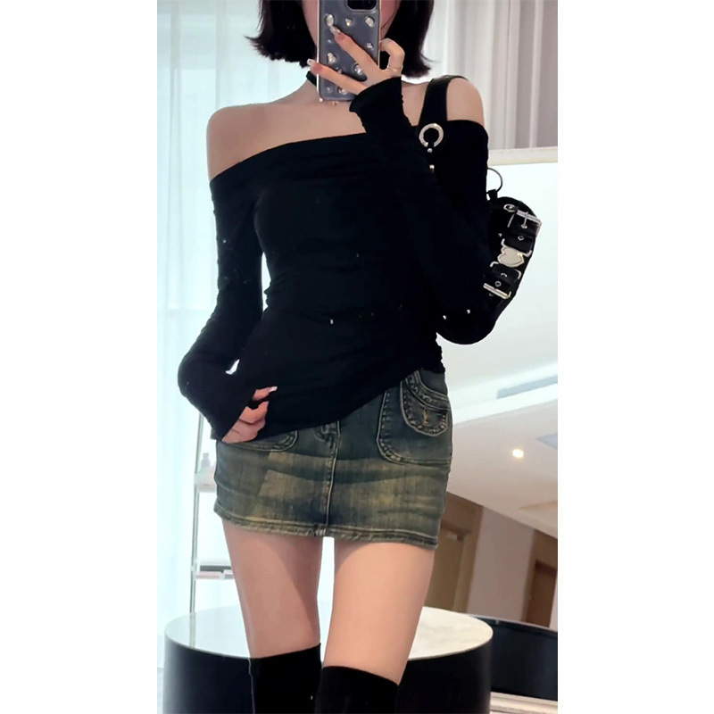 향신료 소녀 어깨 탑 어깨 셔츠 2024 새로운 이른 봄 여성의 순수한 바람 한국 스타일 긴 소매 왕실 자매스토어 가기