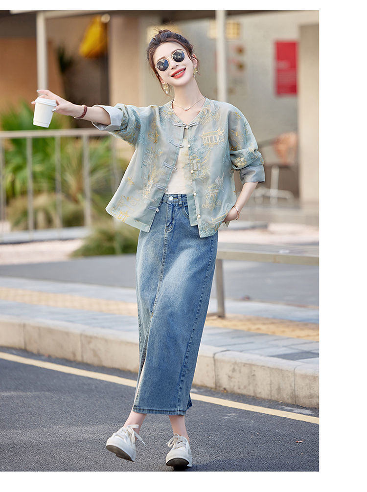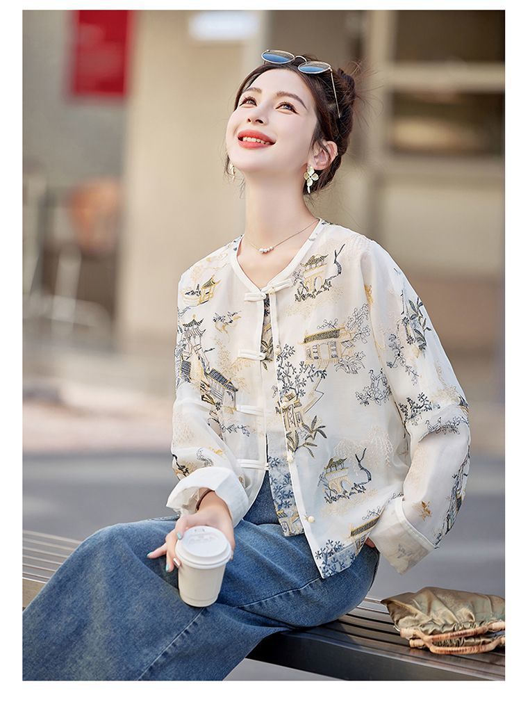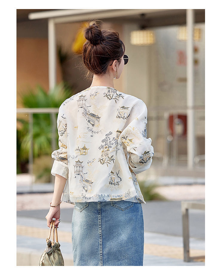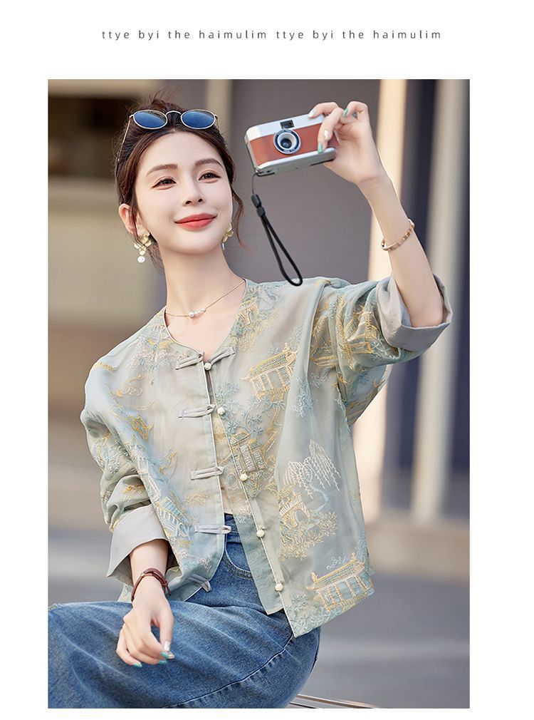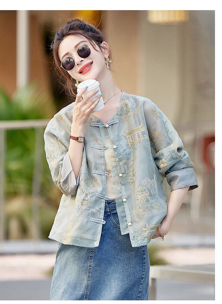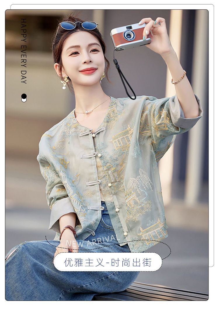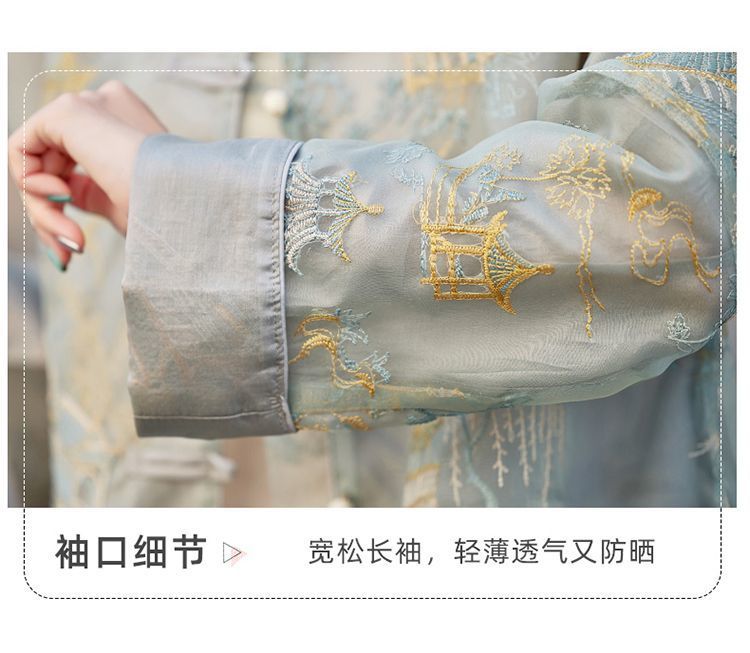 [점포 판매] 새 중국 수놓은 선스크린코트 여자 2025 년 여름 새 경량 라운드 넥 긴소매 캐주얼
