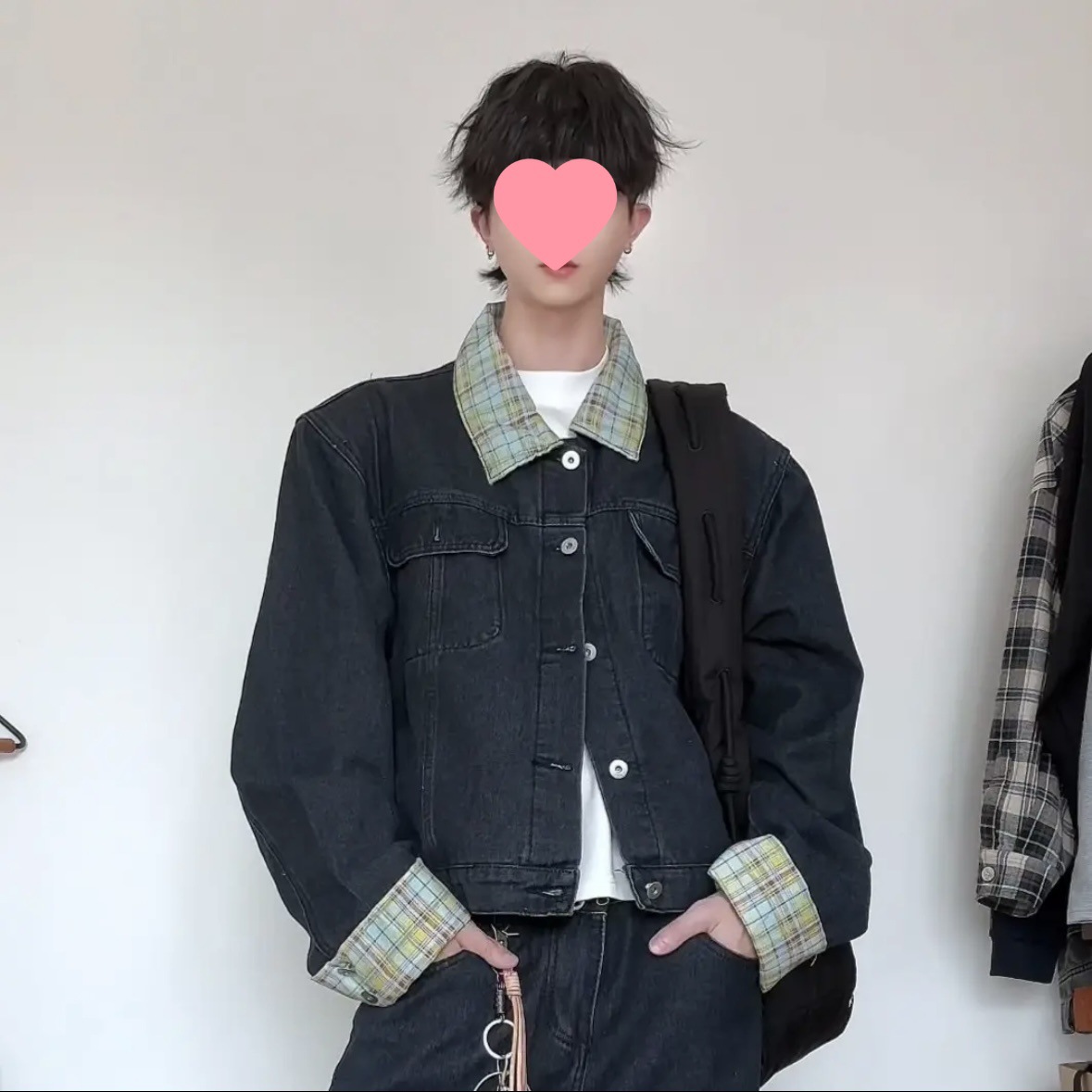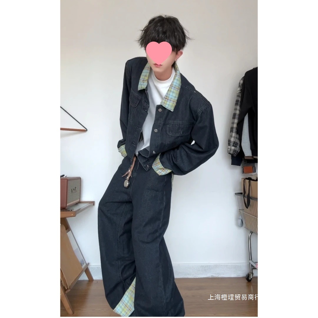 흑백 회색 남성 의류 매장 코트 봄과 가을 미국 데님 세트 남성과 여성의 느슨한 복고풍 잘 생긴 트렌디 한 바닥 바지