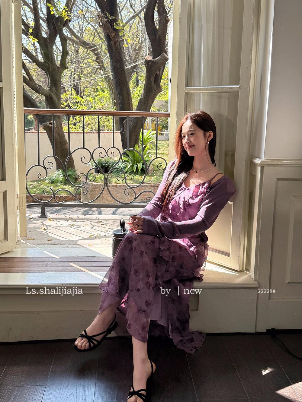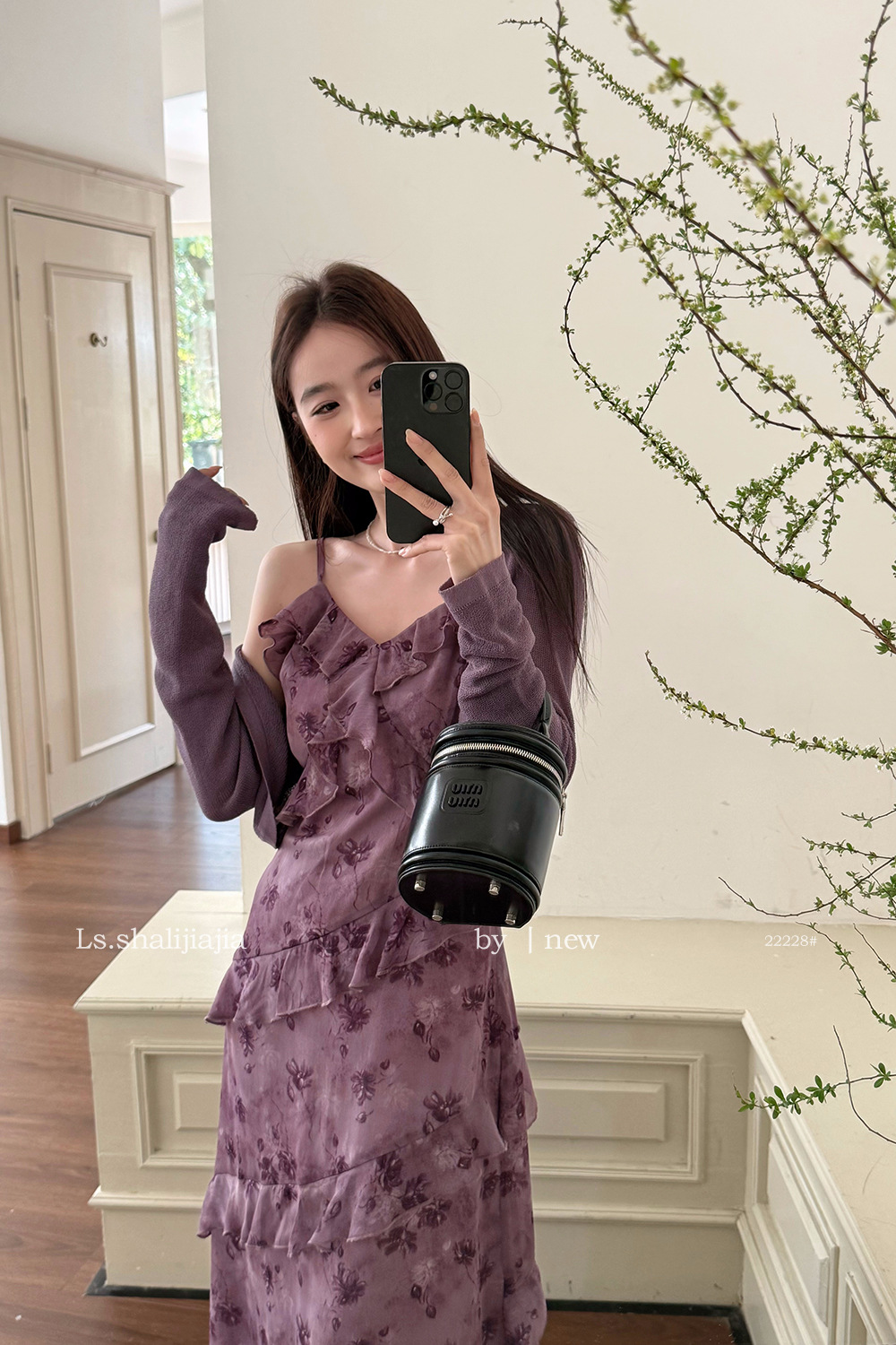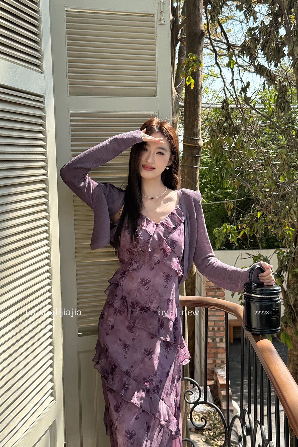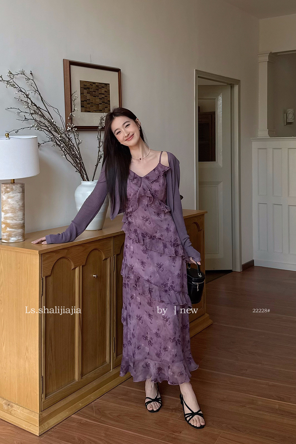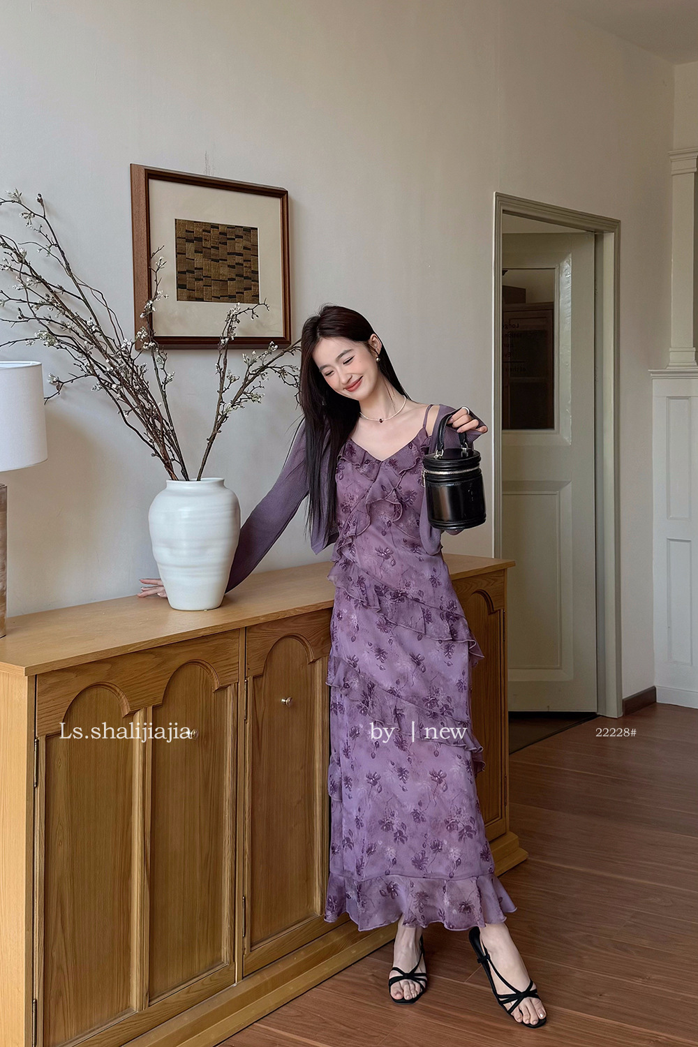 LS 프렌치 스타일 퍼플 러플 서스펜더 롱 스커트 여성 25년 신작 꽃무늬 드레스 22228 #