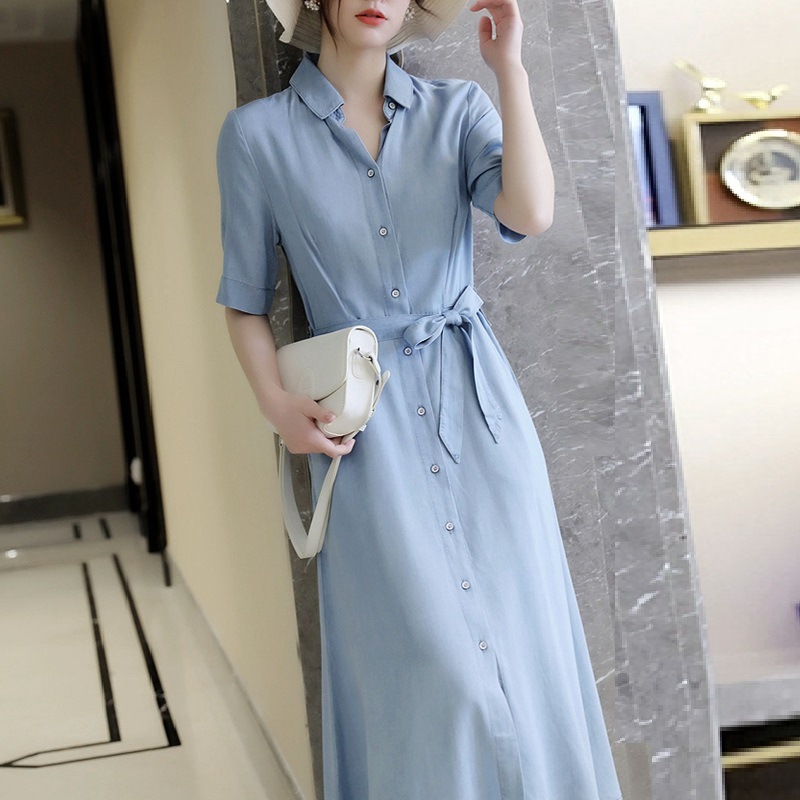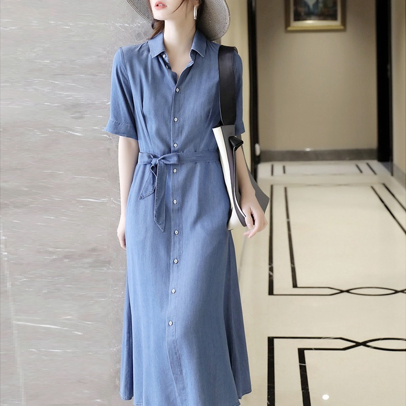 텐셀 데님 원피스 2025 봄과 여름 짧은 소매 새로운 플러스 사이즈 슬림 긴 카디건 스커트 여성스토어 가기