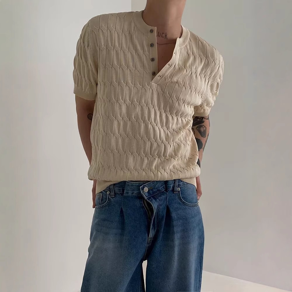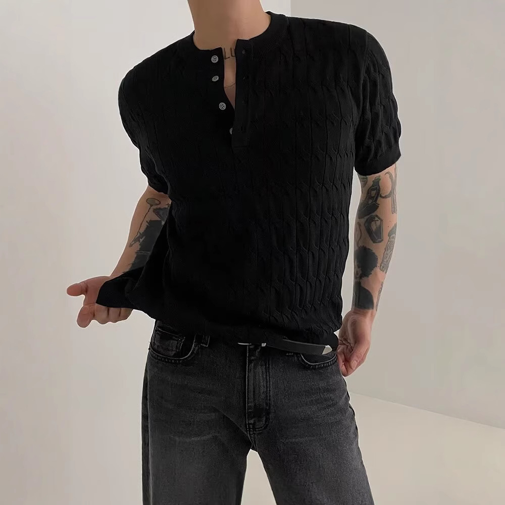 여름 헨리 칼라 니트 티셔츠 남자 반팔 아이스 실크 얇은 트위스트 디자인 한국 패셔너블 루즈 탑