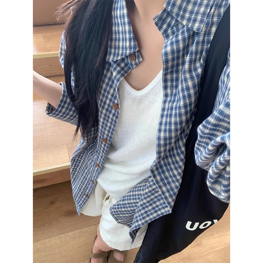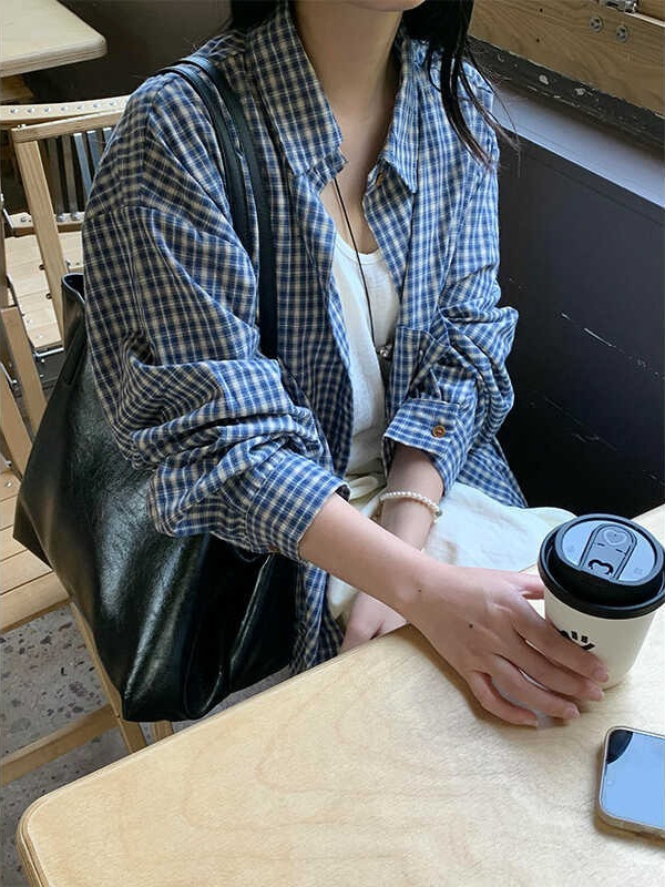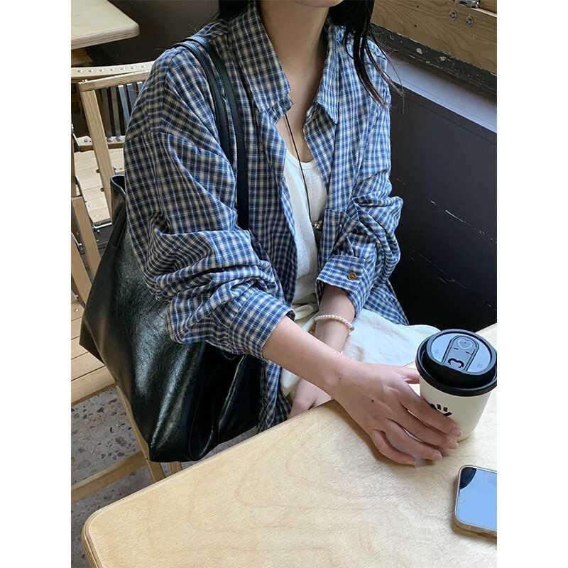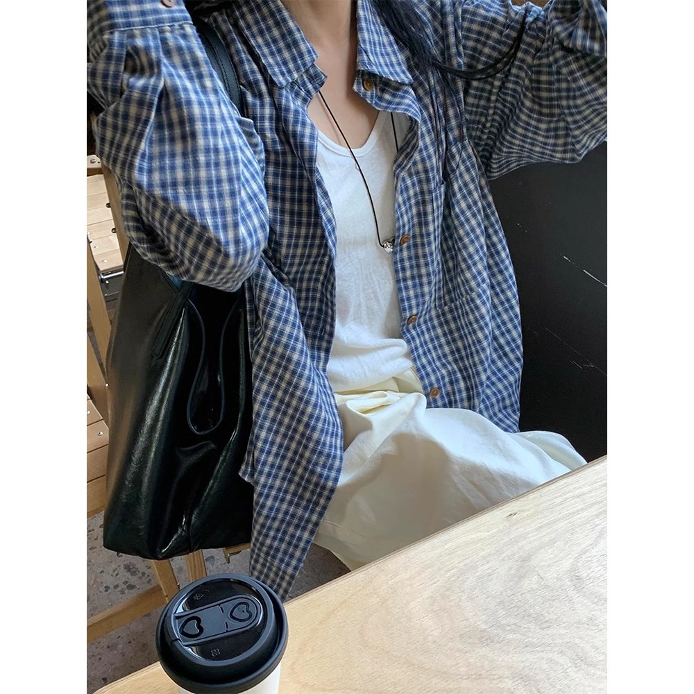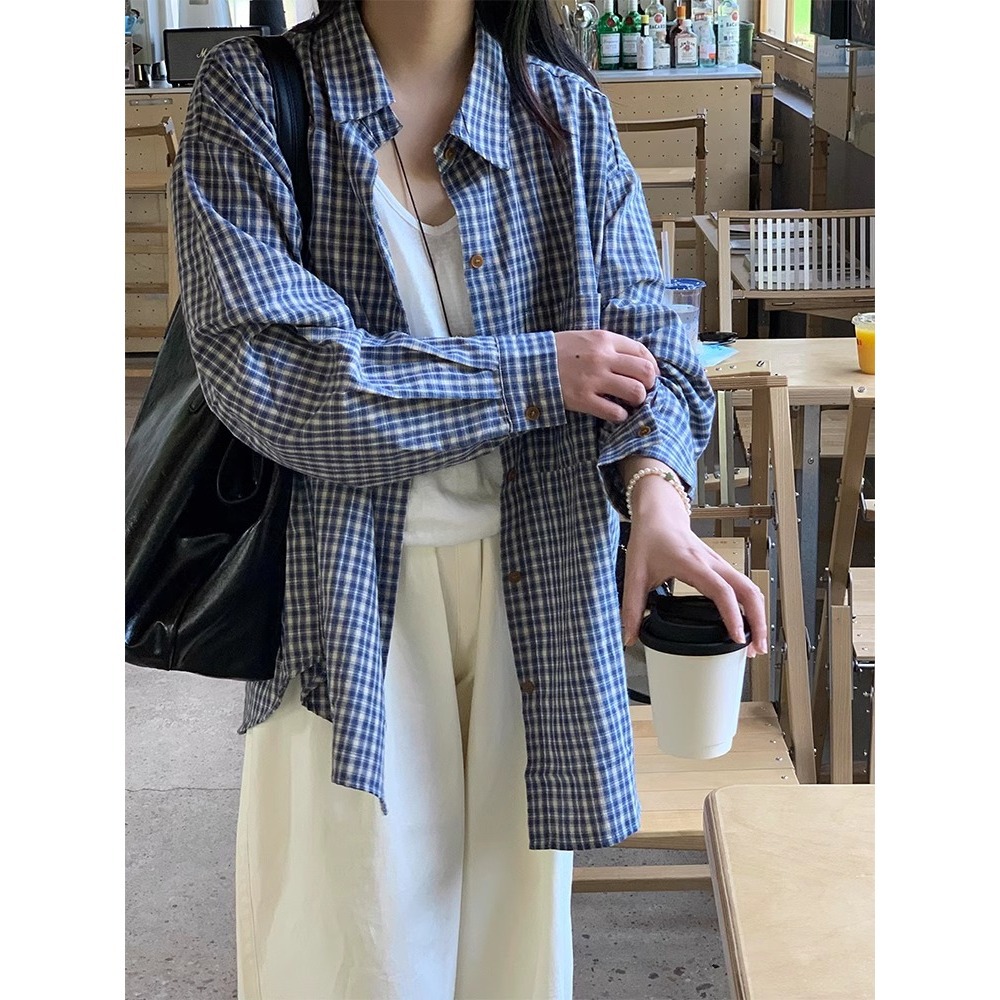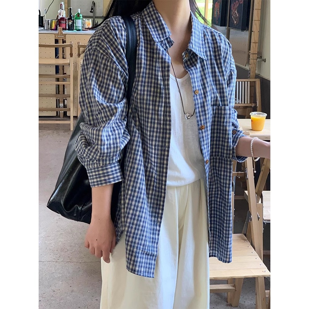 봄과 가을 새로운 복고풍 격자 선 스크린 셔츠 여성의 2025 새로운 캐주얼 게으른 스타일 느슨한 긴팔 셔츠 재킷스토어 가기