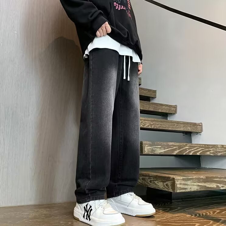 봄 일본 Drawstring Elastoic 허리 청바지 남성용 루즈 스트레이트 트렌디 와이드 레그 캐주얼 트렌디 긴 바지