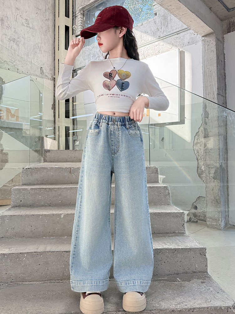 대외 무역 어린이 바지 도매 소녀 청바지 봄과 가을 조수 시원한 스트레이트 바지 소녀 웨스턴 스타일 올 매치 와이드 레그 바지