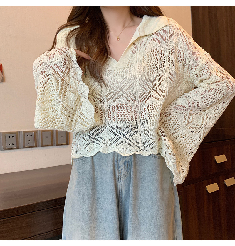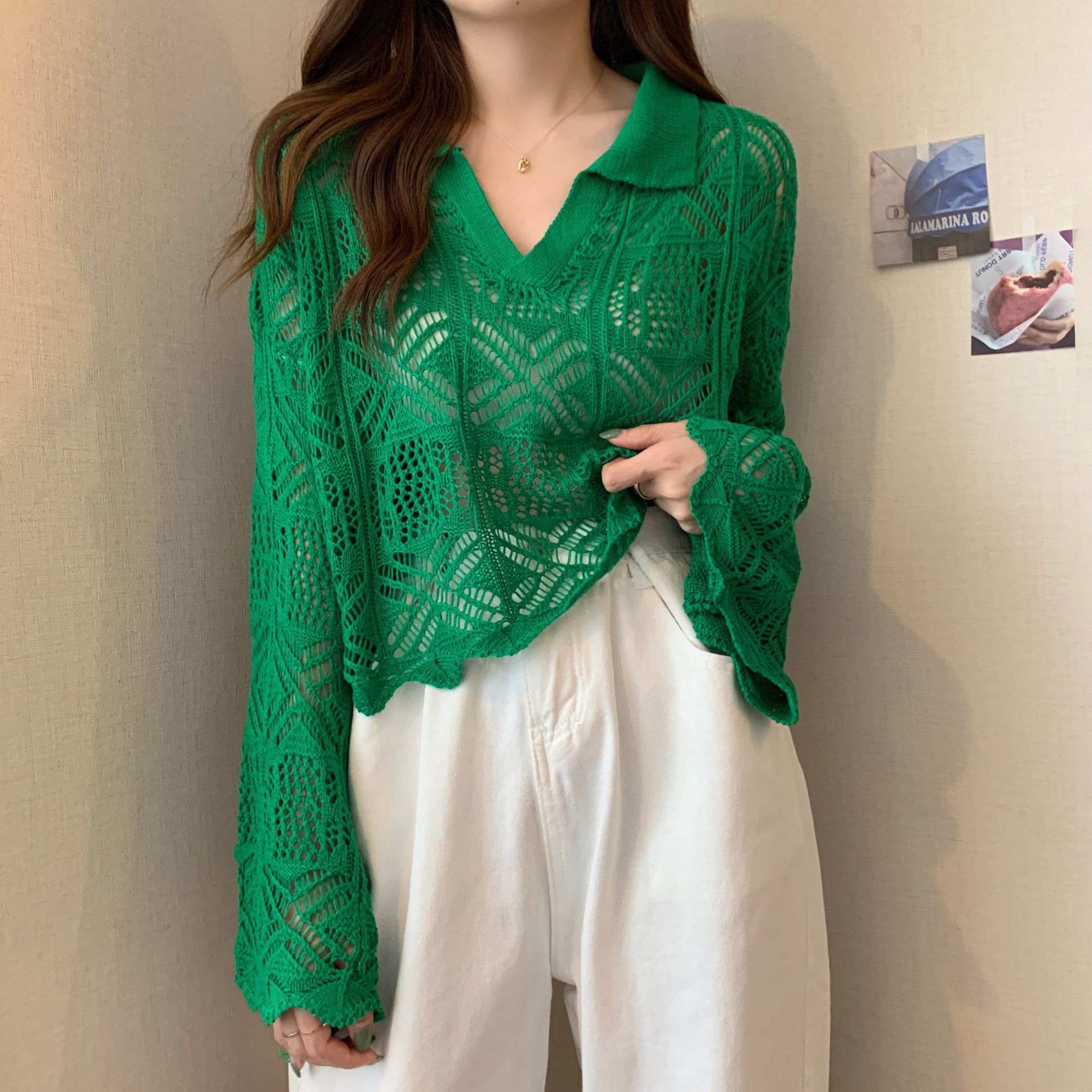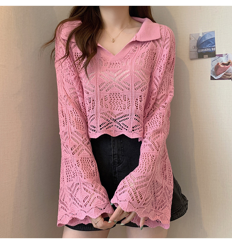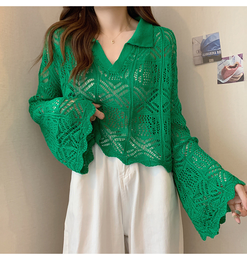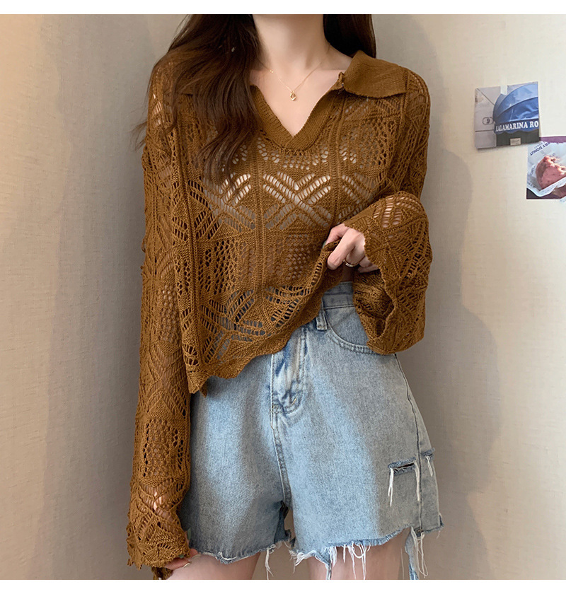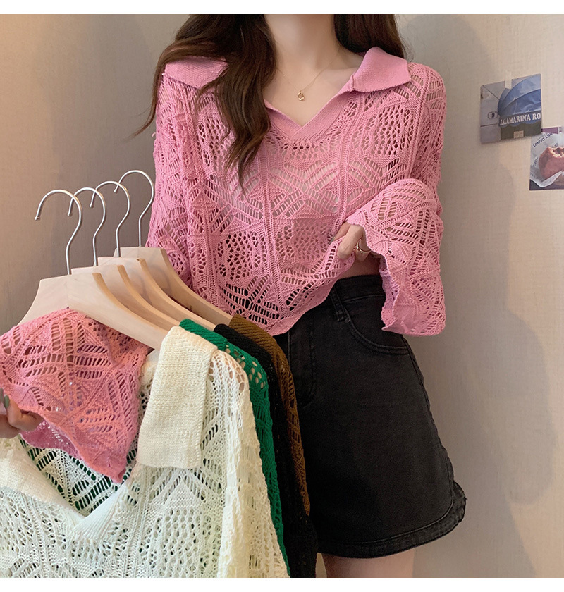 중공 디자인 센스 틈새 이른 봄 블라우스 긴팔 스웨터 여성용 래와 혼 슬리브가 달린 신선하고 달콤한 쇼트 탑