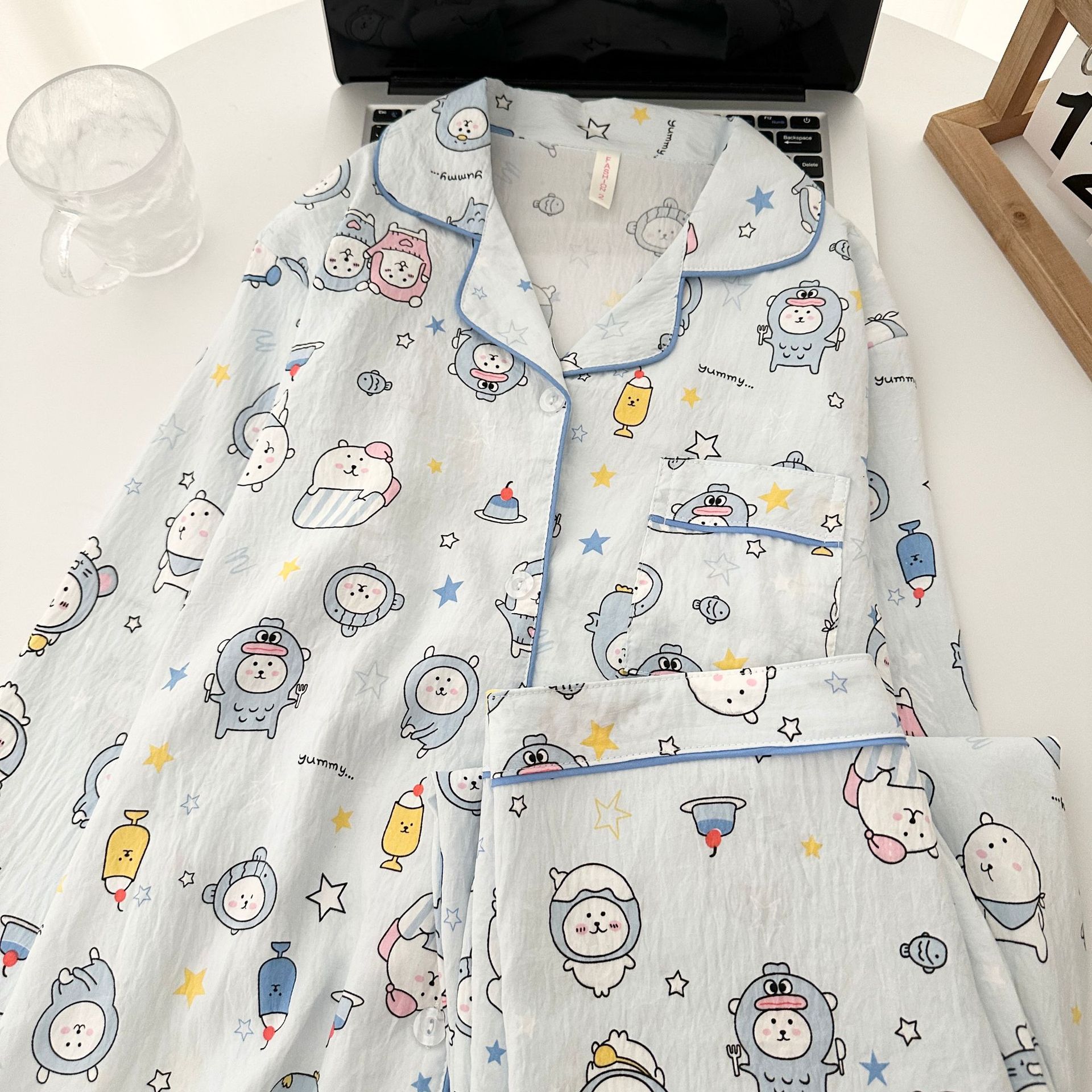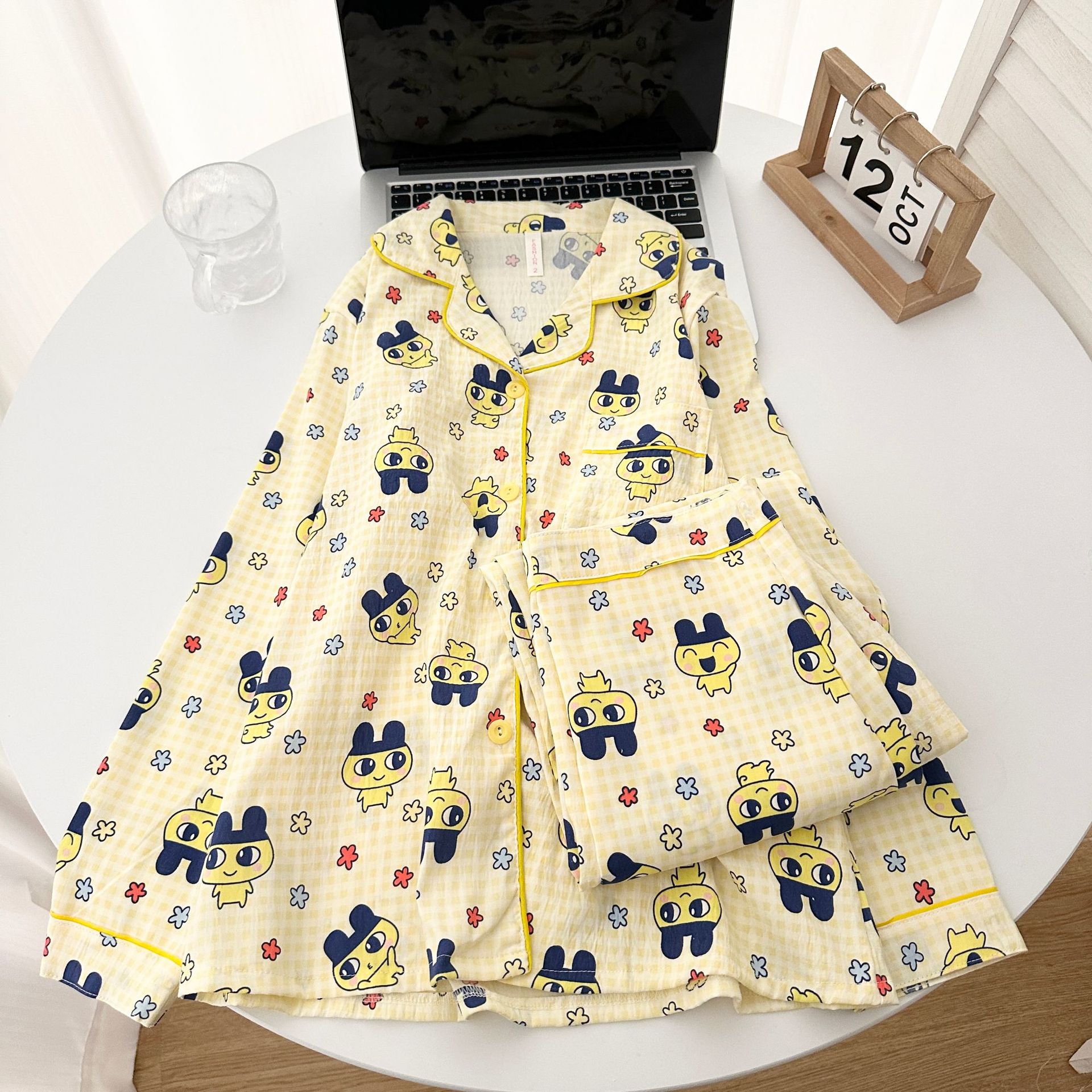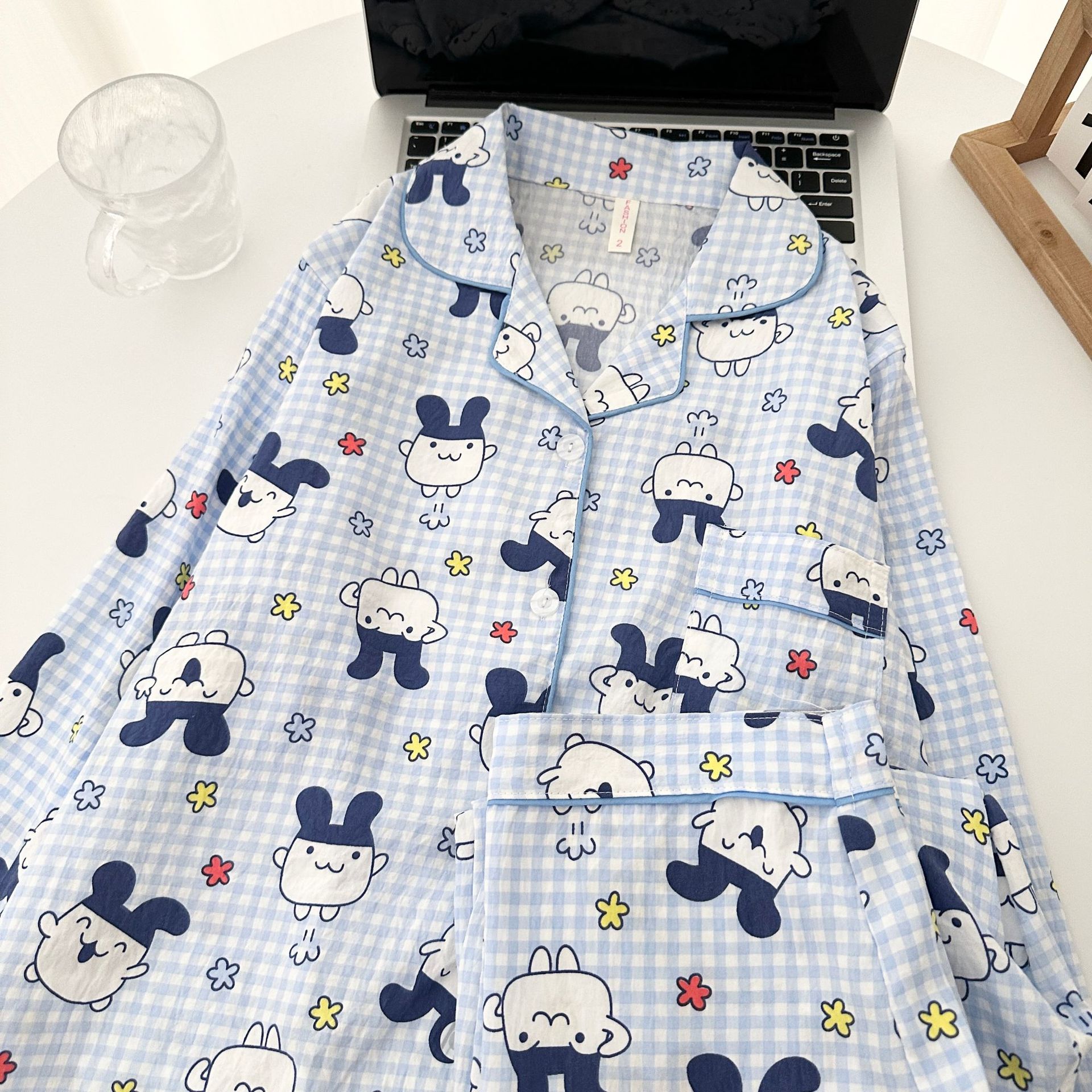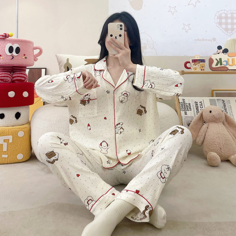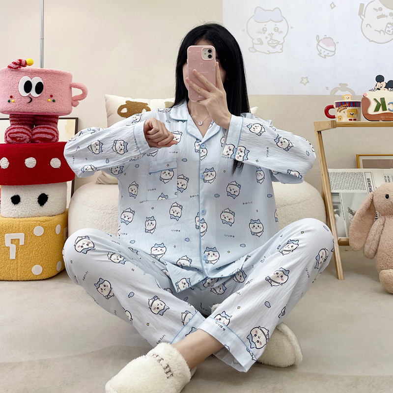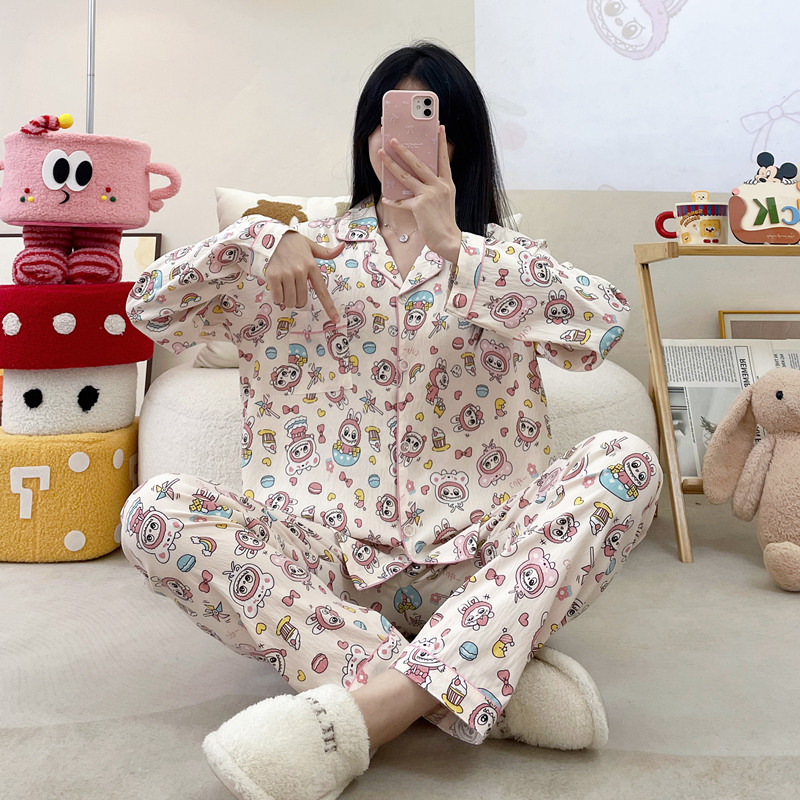 여성용 가을 만화 캐릭터 귀여운 긴팔 긴바지 만화 카디건 라펠 홈웨어 세트, 크로스보더 도매 클라우드 코튼 파자마