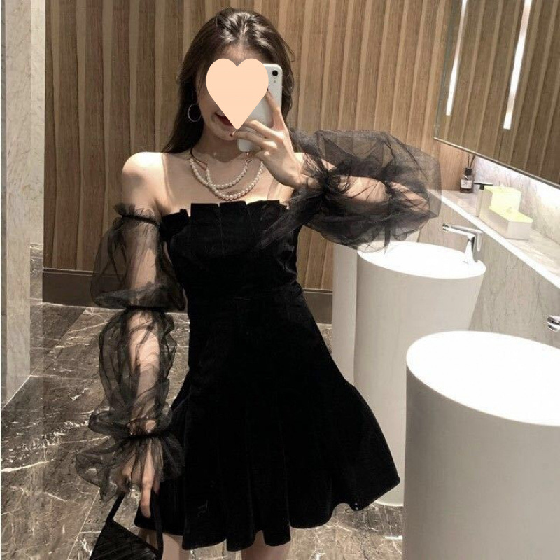 봄과 여름 2024 새로운 스타일의 우아한 메쉬 퍼프 소매 블랙 스커트 어깨 벨벳 허리 퍼프 원피스 여성 의류스토어 가기