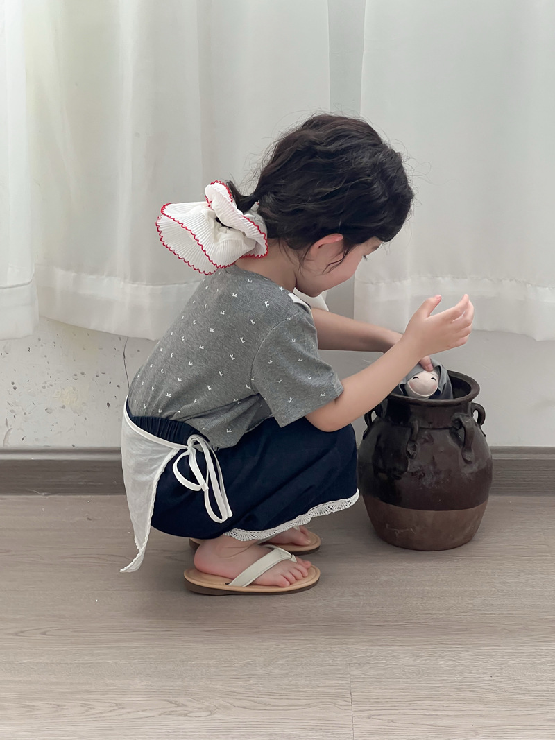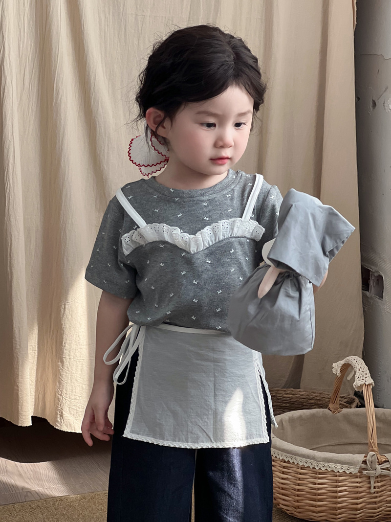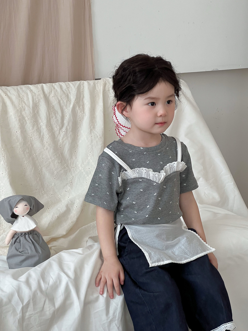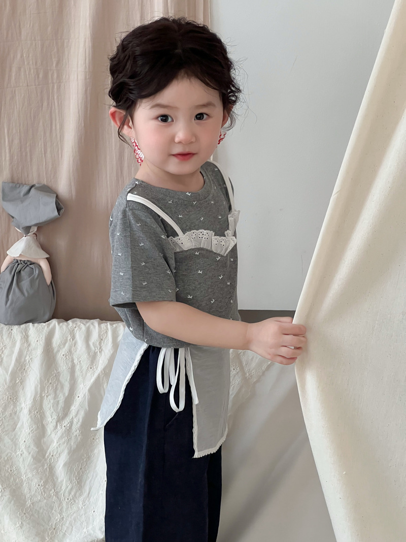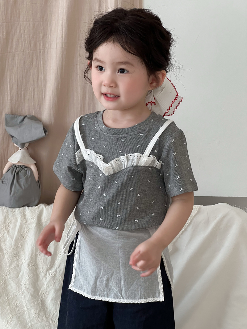 한국 스타일 활 프린트 티셔츠 2025 여름 신상 소녀 반팔 레이스 탑 어린이 스타일 티셔츠 슬링스토어 가기