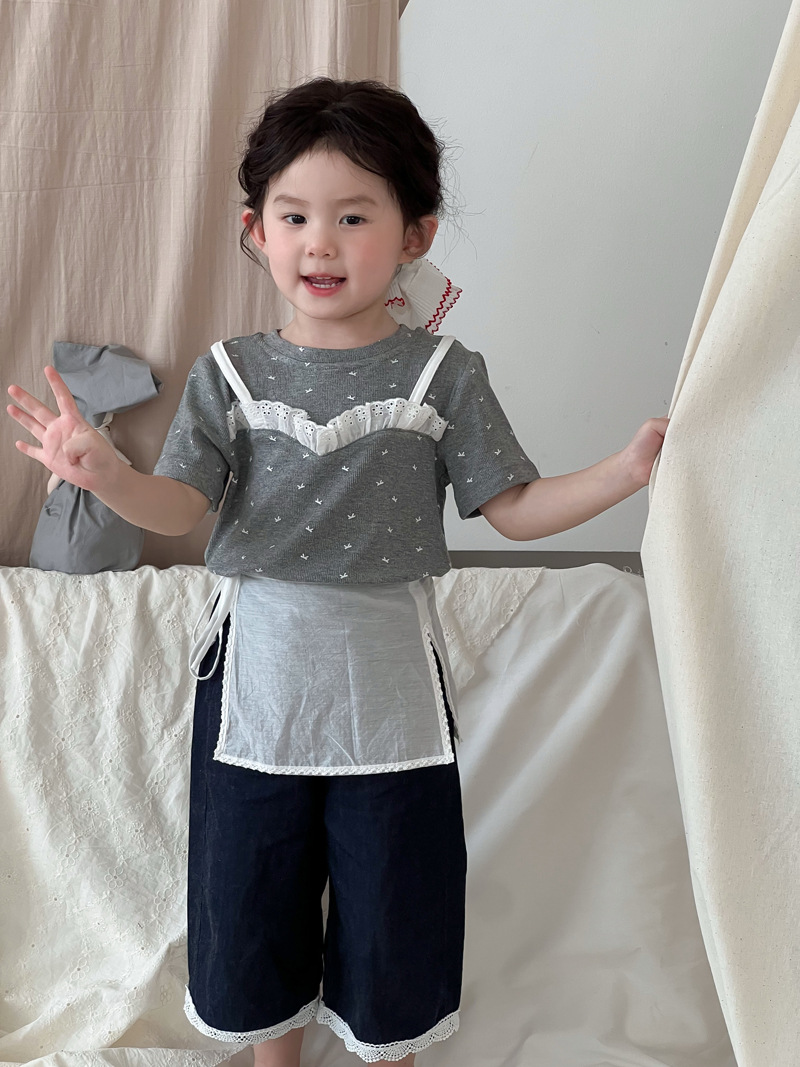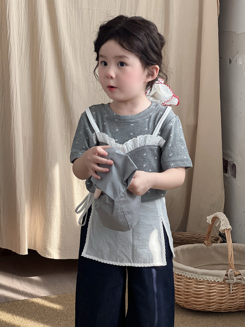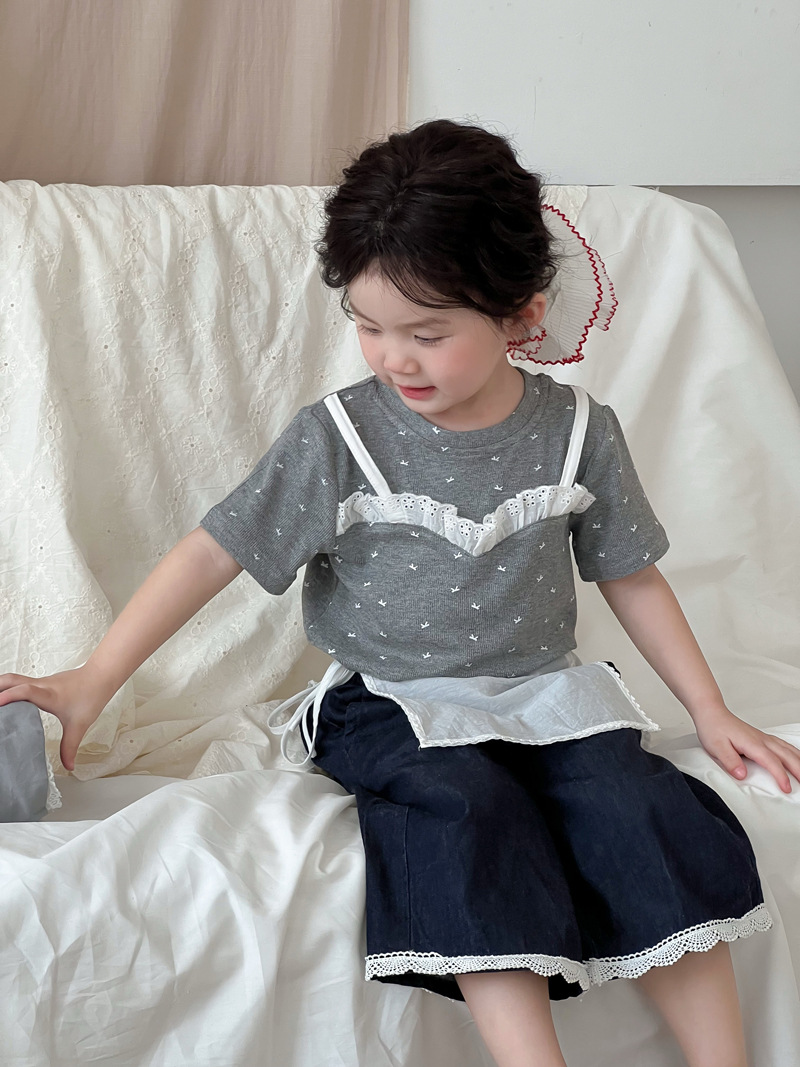 한국 스타일 활 프린트 티셔츠 2025 여름 신상 소녀 반팔 레이스 탑 어린이 스타일 티셔츠 슬링