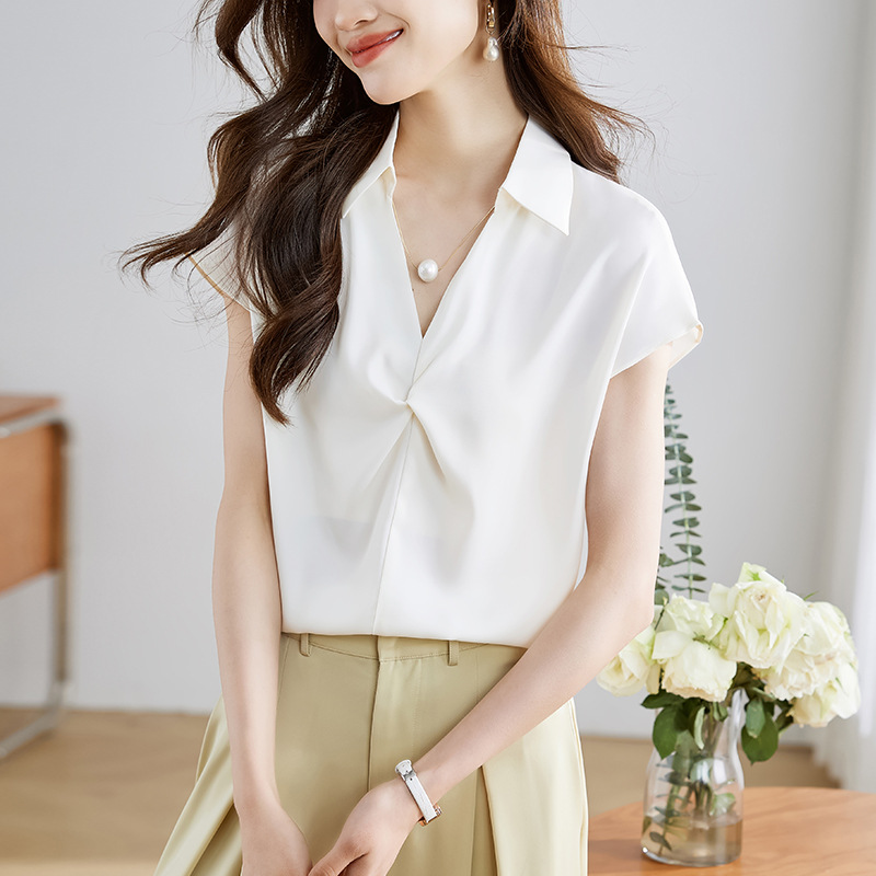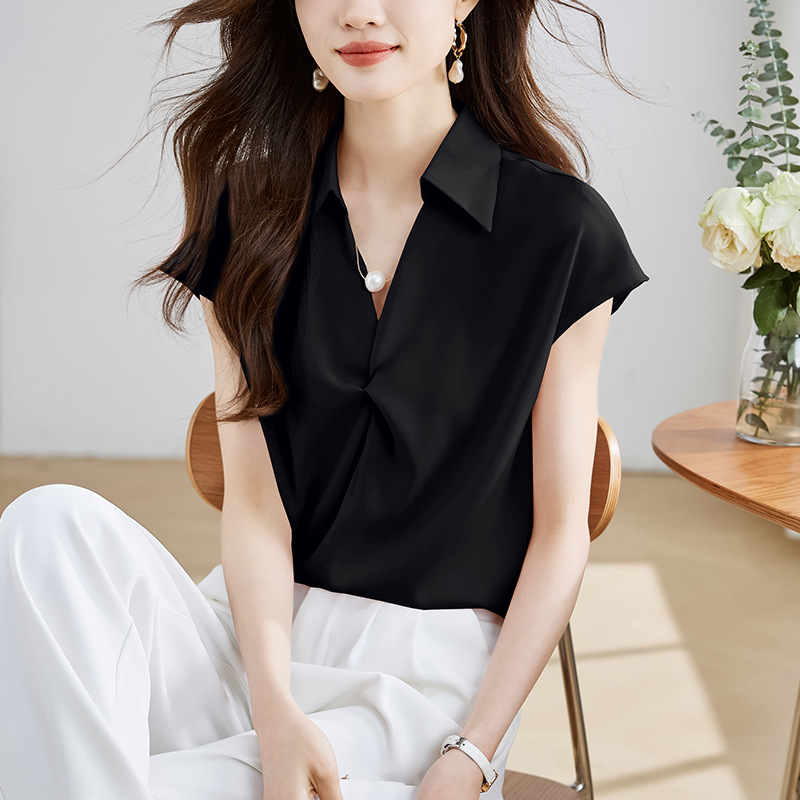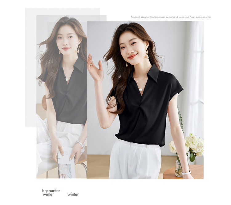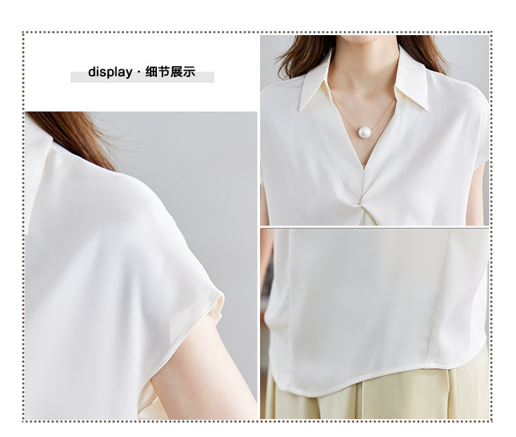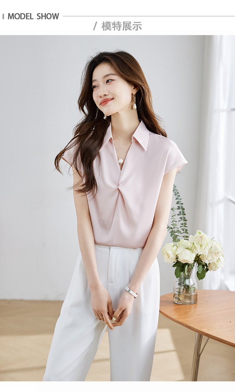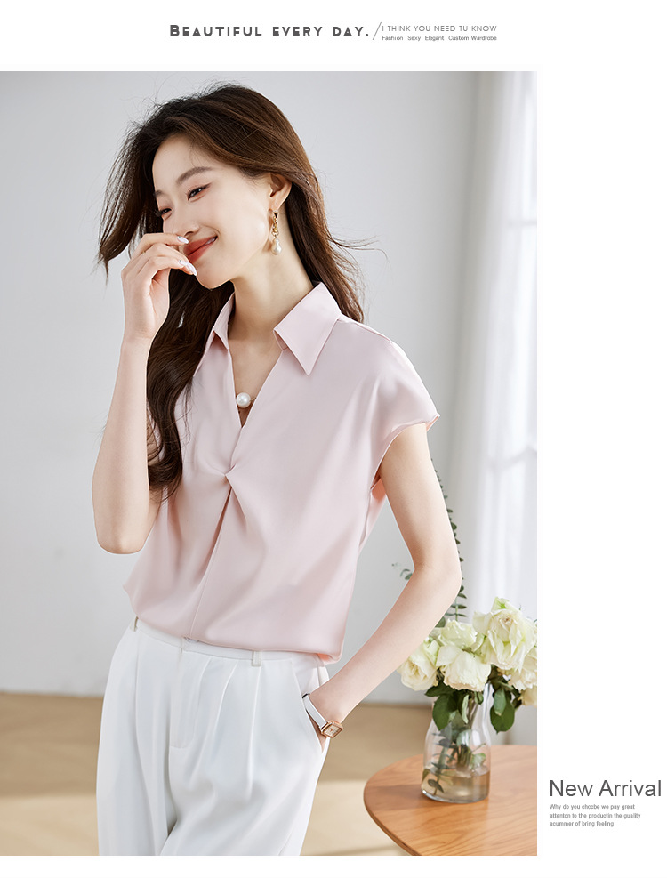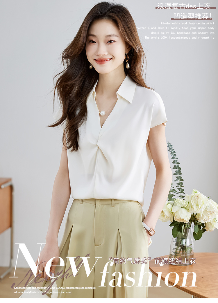 프랑스 스타일 틈새 서양식 반팔 셔츠 여성용 2024 여름 핑크 펄 체인 디자인 센스 전문 통근 탑스토어 가기