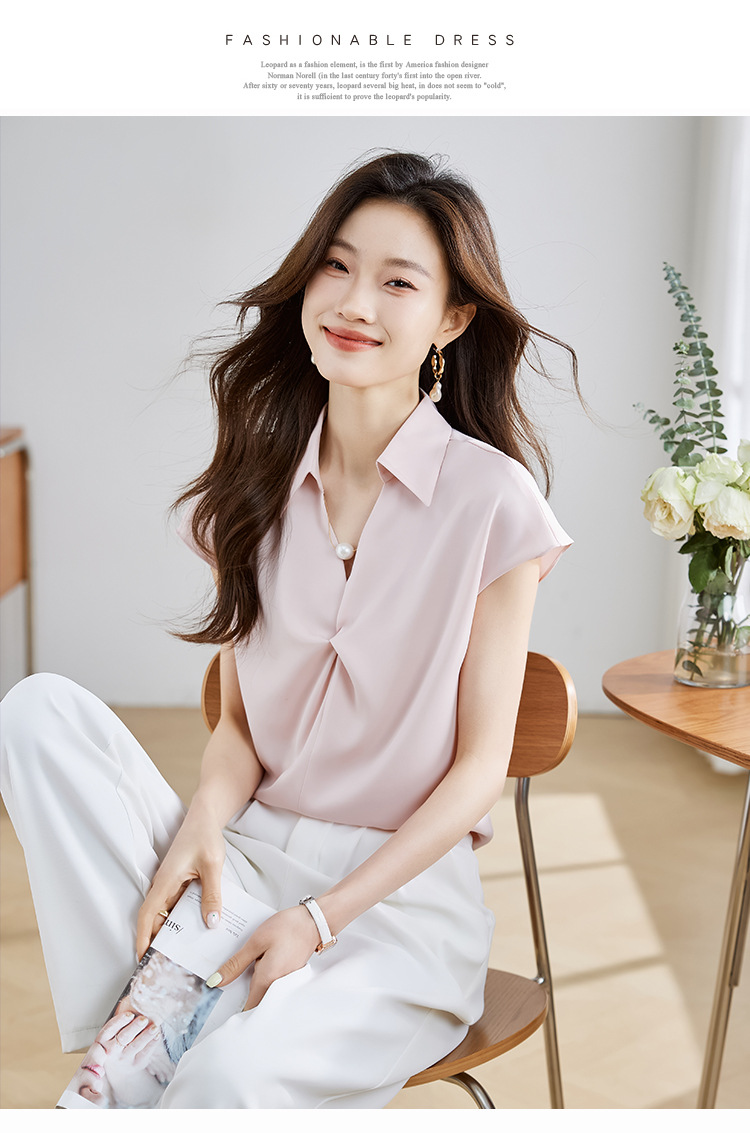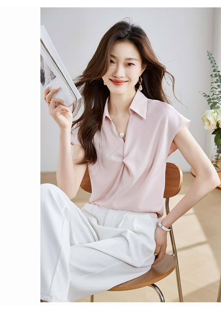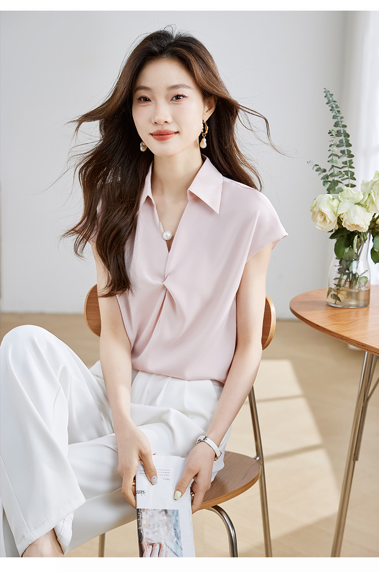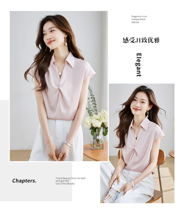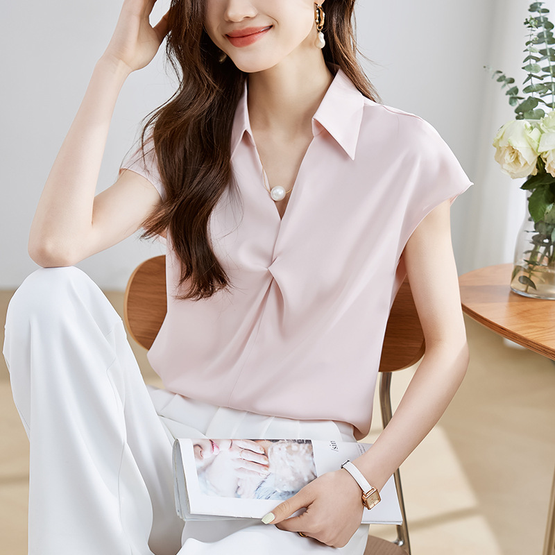 프랑스 스타일 틈새 서양식 반팔 셔츠 여성용 2024 여름 핑크 펄 체인 디자인 센스 전문 통근 탑