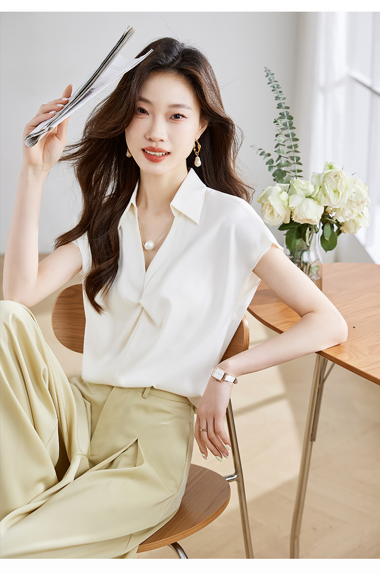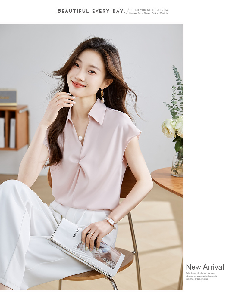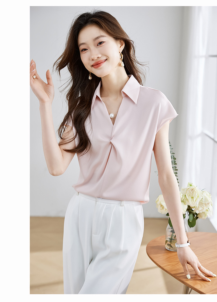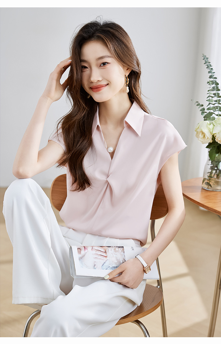 프랑스 스타일 틈새 서양식 반팔 셔츠 여성용 2024 여름 핑크 펄 체인 디자인 센스 전문 통근 탑