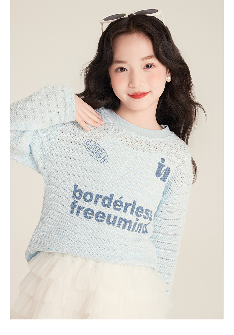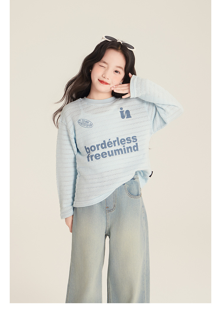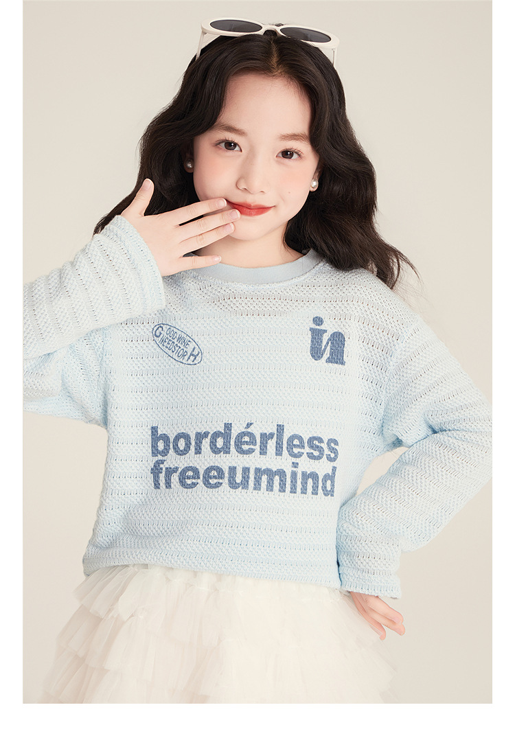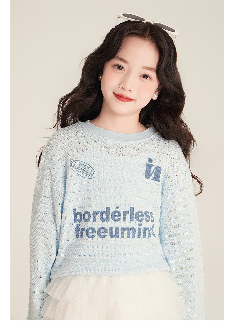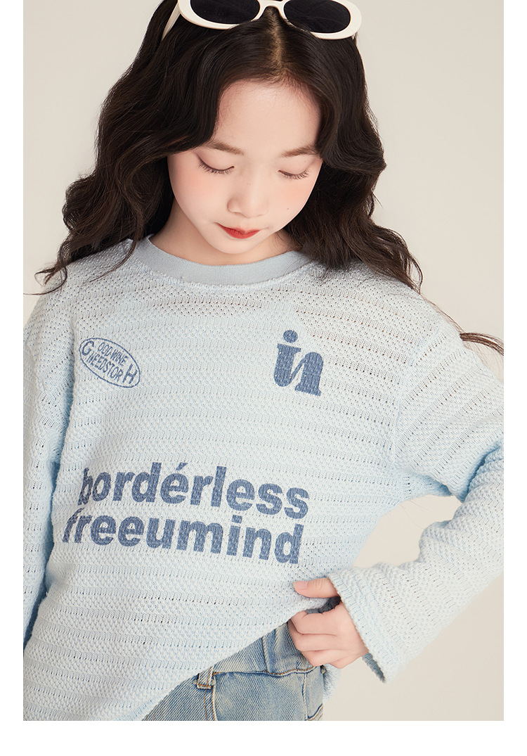 Amybaby Girls 'Top Spring 2025 새로운 미국 스타일 느슨한 둥근 목 캐주얼 할로우 아이스 실크 니트 블라우스스토어 가기