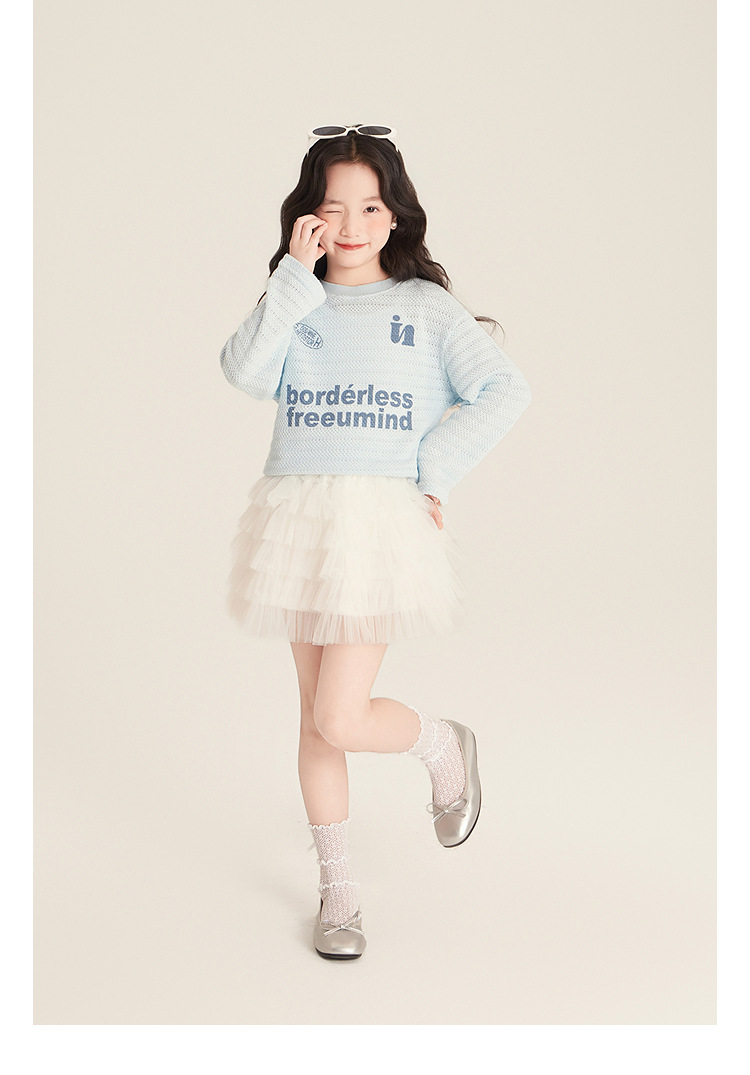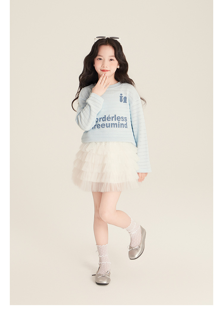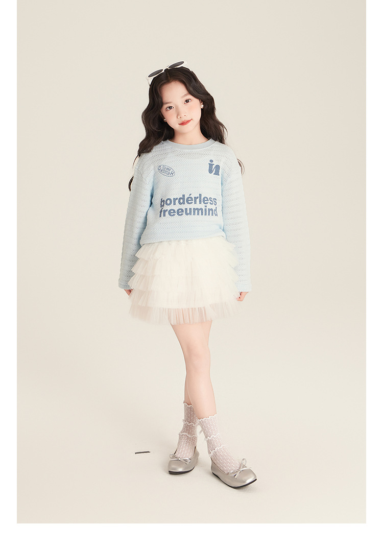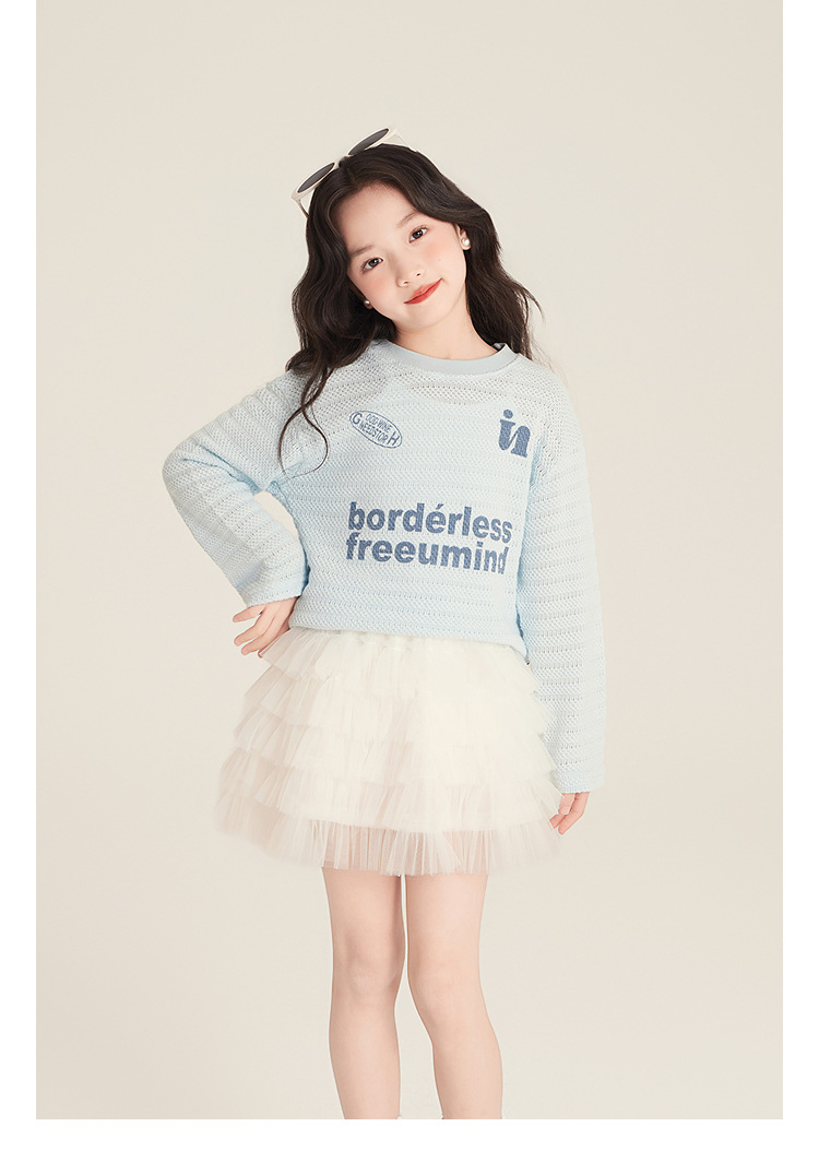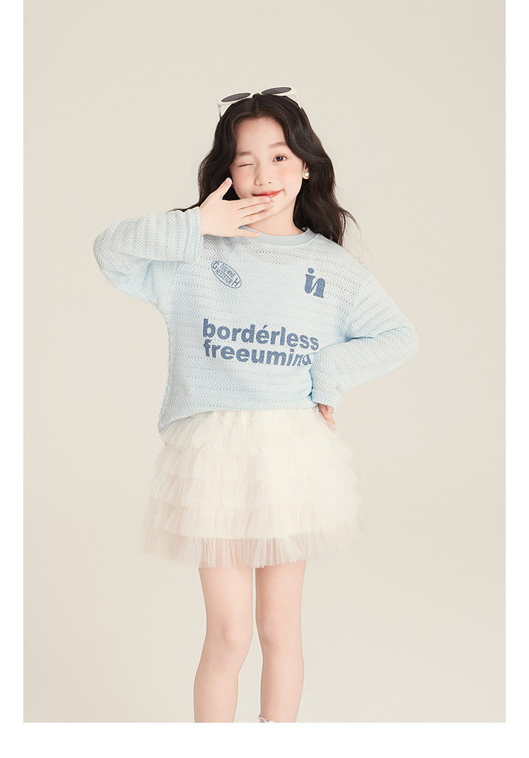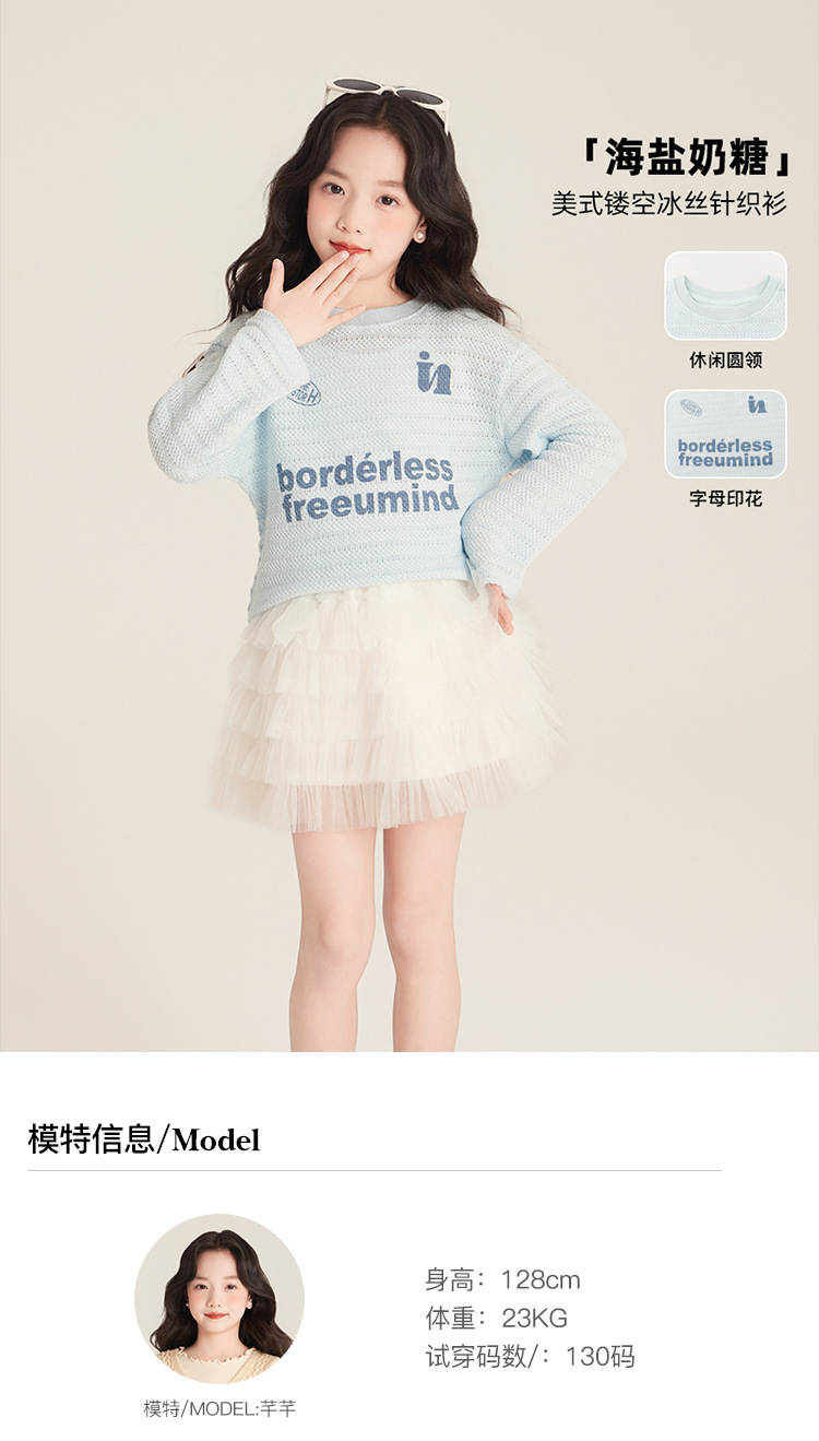 Amybaby Girls 'Top Spring 2025 새로운 미국 스타일 느슨한 둥근 목 캐주얼 할로우 아이스 실크 니트 블라우스스토어 가기