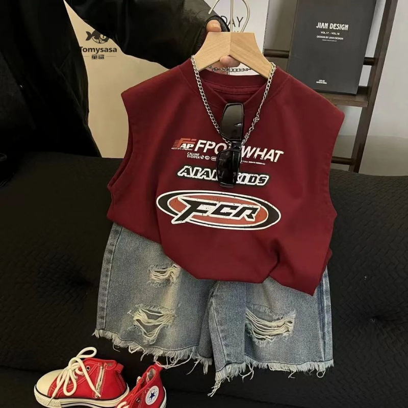 소년 세트 여름 새로운 한국식 유행 편지 인쇄 세련된 립 데님 반바지 블로우 스트리트