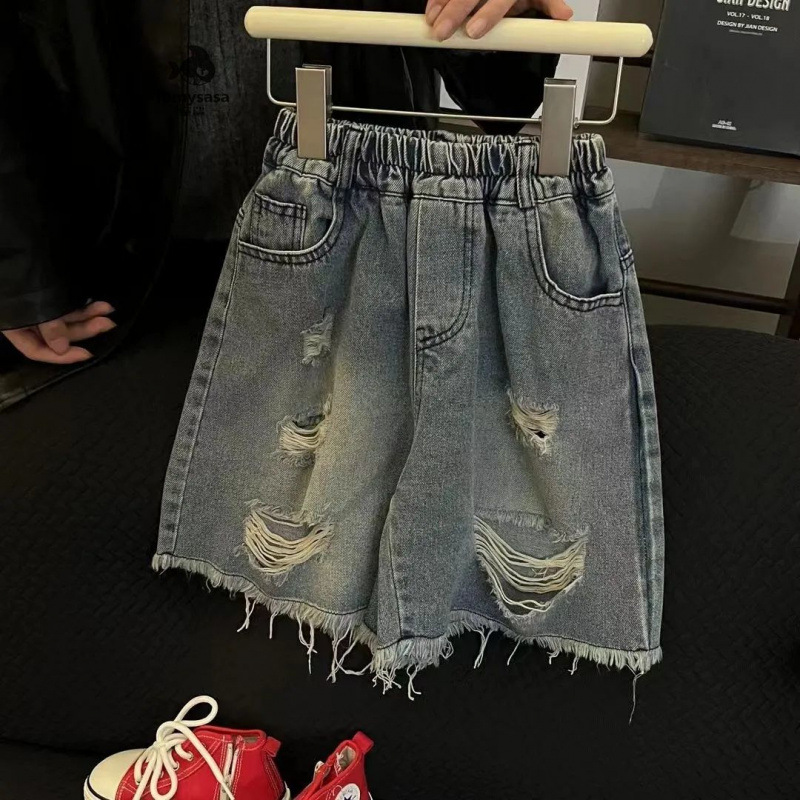 소년 세트 여름 새로운 한국식 유행 편지 인쇄 세련된 립 데님 반바지 블로우 스트리트스토어 가기