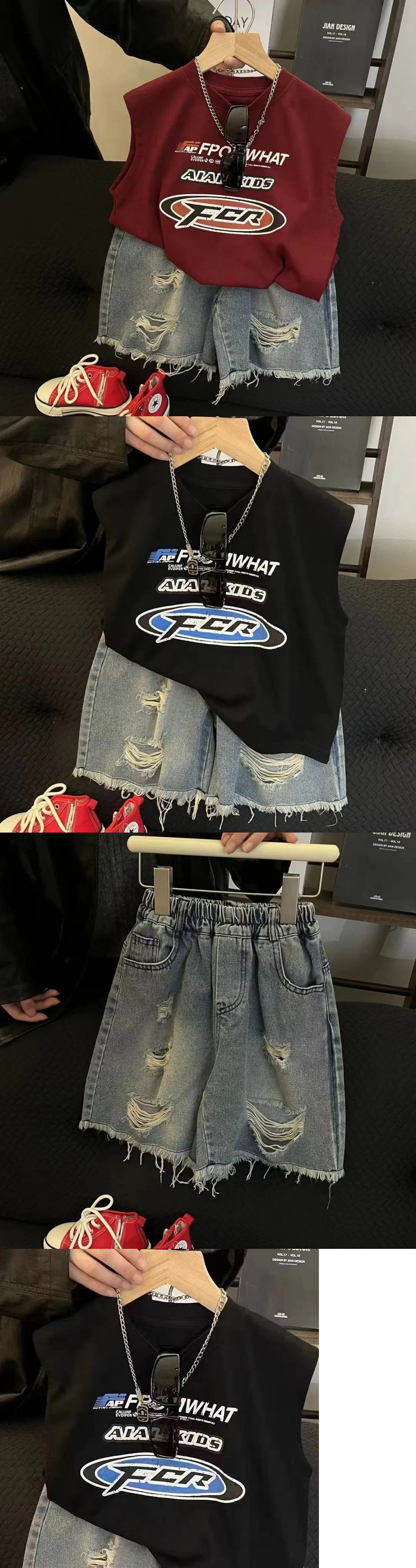 • 레드 민소매 + 블루 데님 반바지