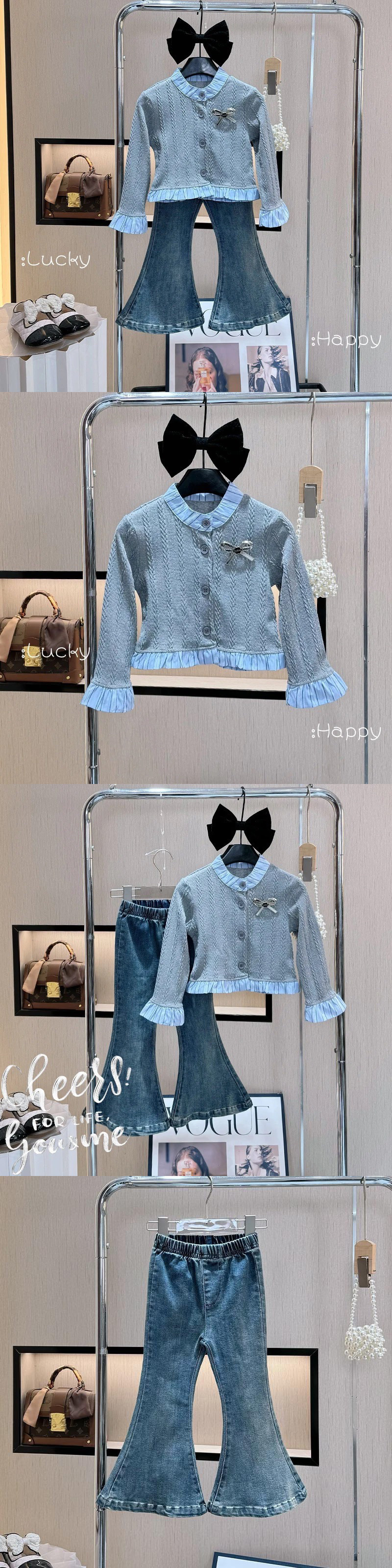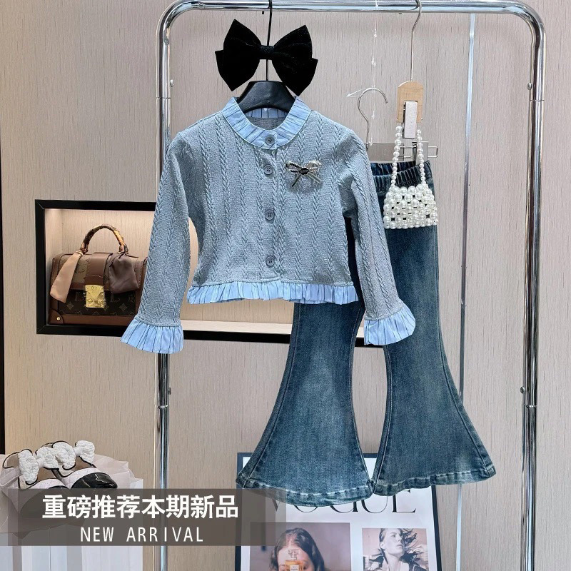 소녀의 봄 세트 2025 새로운 어린이 카디건 데님 꽃 무늬 바지 두 조각 유행 봄 원피스